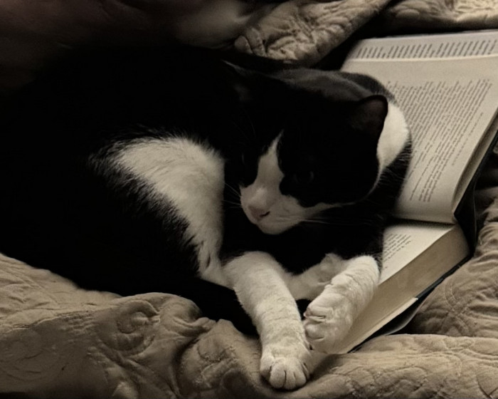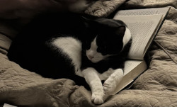 Lewis doesn’t like me to do anything that doesn’t involve him. So he reads with me. He’s a 16 pound, 5 year old tuxedo, beauty. My best bud
