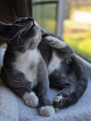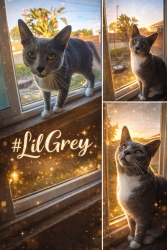 Lil grey is kitten that my son rescued in a park in a cat carrier in the hot sun.He is a curious,energetic& lovable kitten.Our Blessing.
