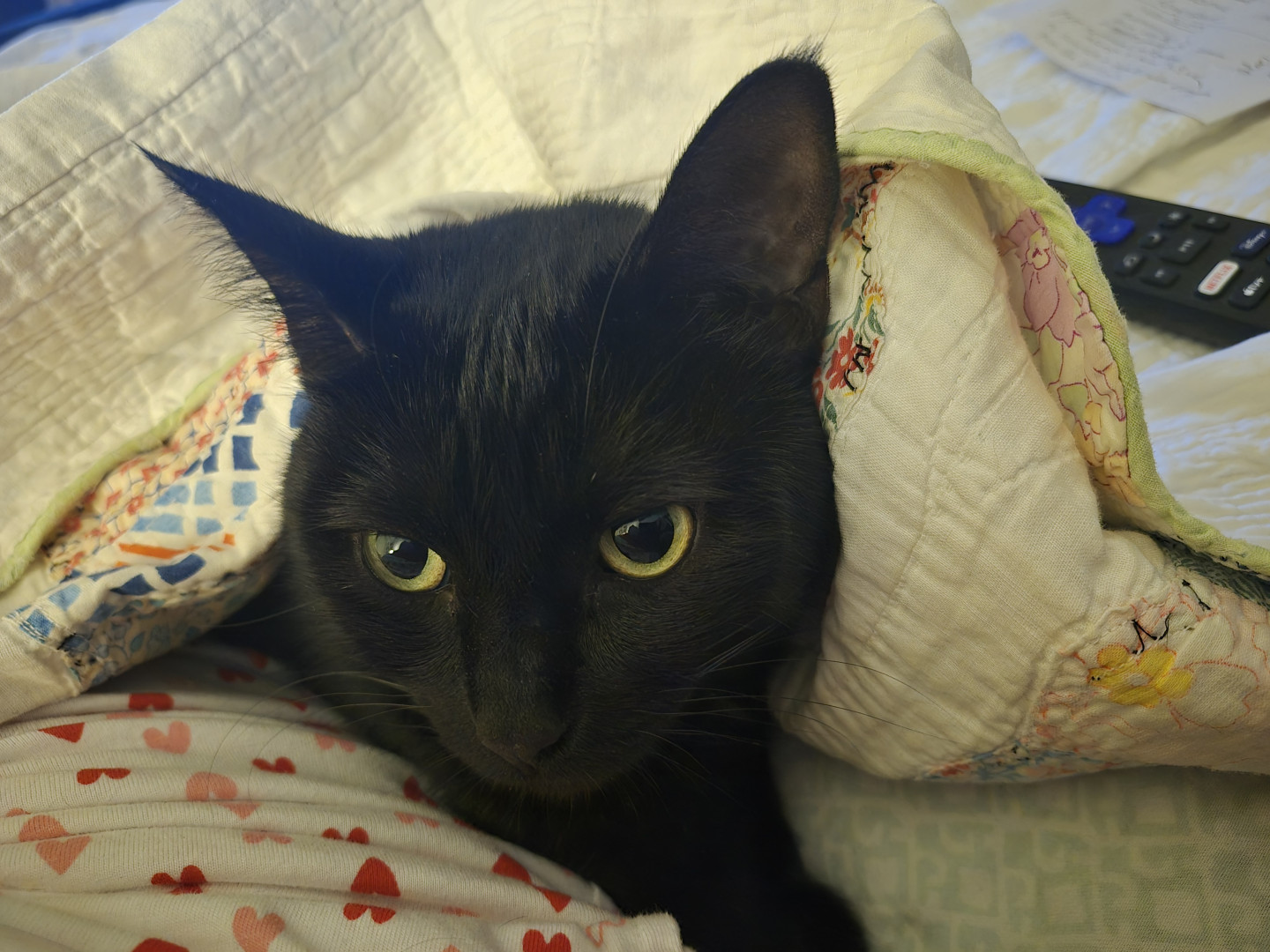She is a black cat and gets a bad rap by the superstitious, but she is quiet affectionate.