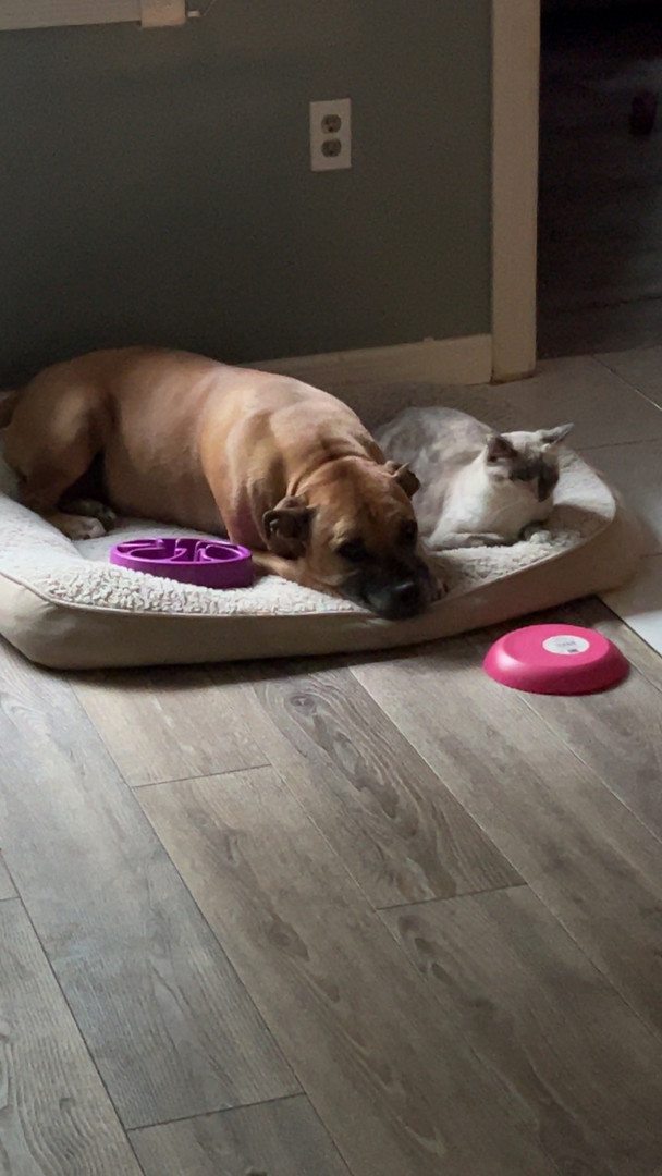 Learn MoreLily is obsessed with feathers. Whatever a feather is attached to is her favorite toy. She also enjoys to play with the dog toys, speed kicking them with both of her back feet as she holds the toy with her front feet. Her favorite snack is the lickums tubes, much preferred and less complained about by her over her prescription diet for allergies.