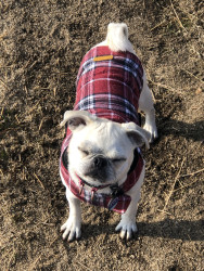 Not only is Lily Pearl unique in her color and look, for a pug, her coat is super soft and she is super smart. She retrieves like a lab and she actually uses the ‘Hunger for Words’ communication buttons to talk to me. I only have four buttons, eat, tug-tug, potty and walk! But she uses them to communicate.