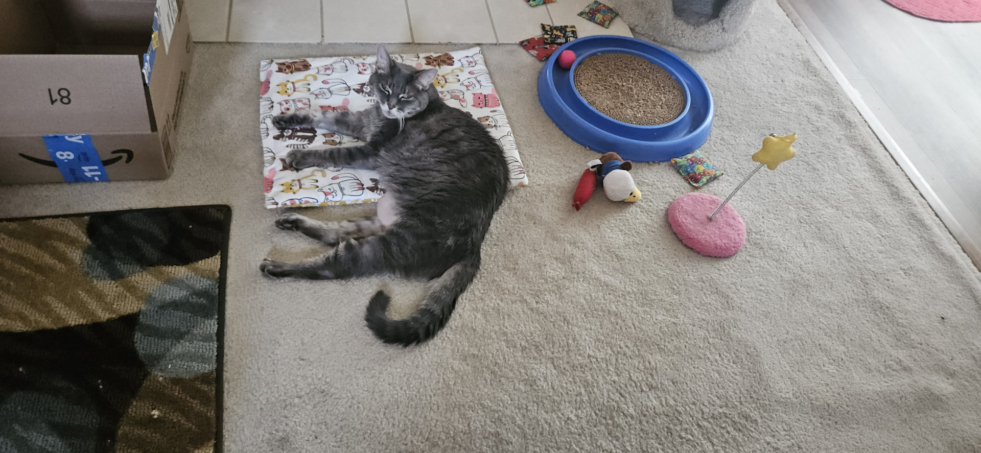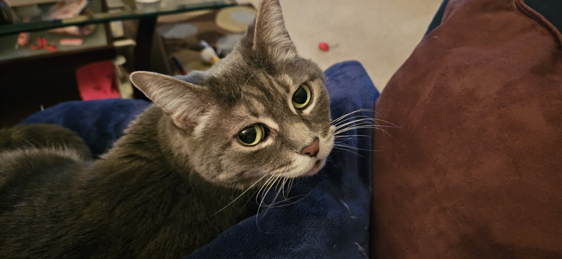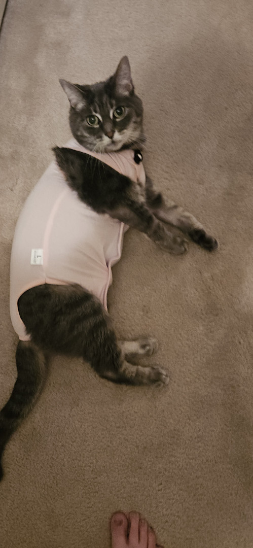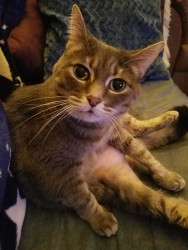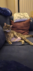 Lily is a gray tabby that is fun loving and can't get enough of her cuddles with me. She enjoys sleeping at the end of my bed with me.