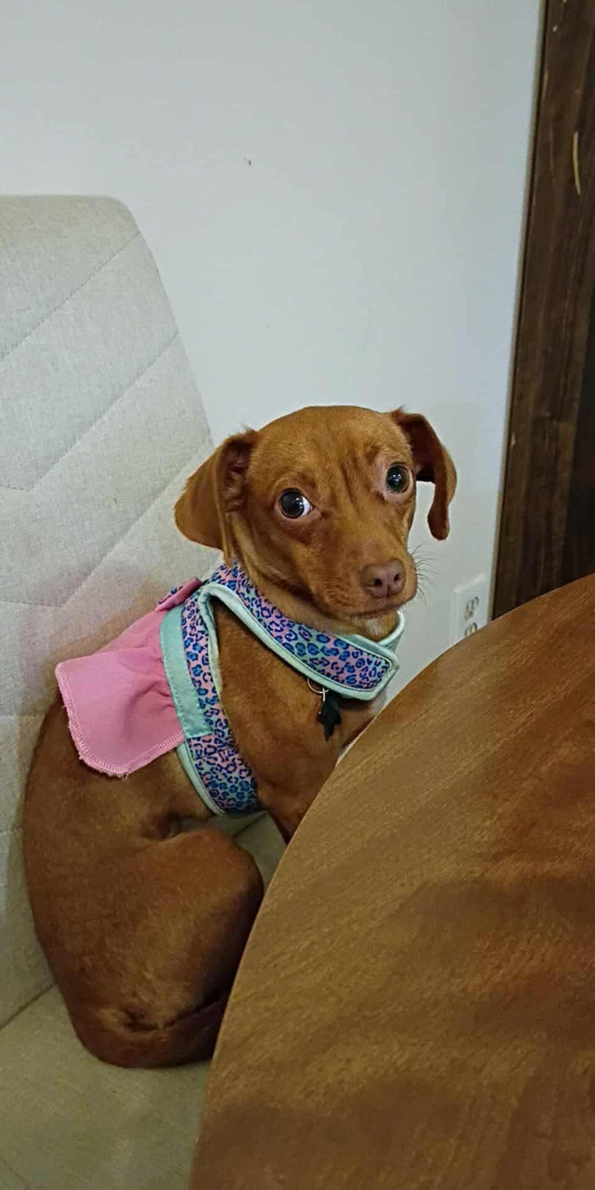 Lily is a caramel colored Chiweenie. She’s half chihuahua and half dachshund. She is 2 years old. She is very loving, sweet and playful.