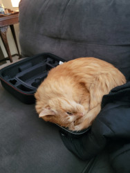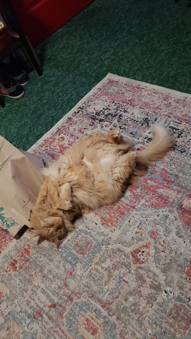 His constant need to fit into any bag or box no matter the size, then randomly finding him in otter mode around the home. He knows he's king of the house and definitely makes a point to make a grand entrance when guests are over.