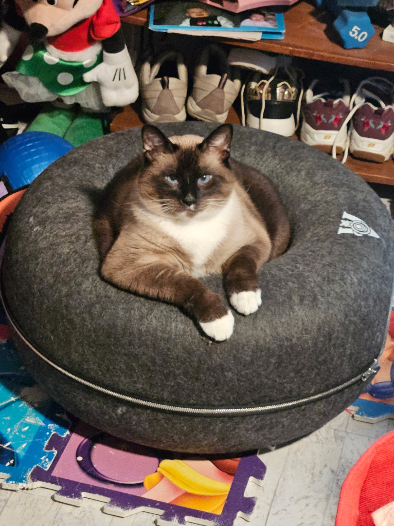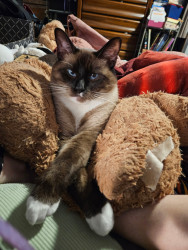 He is a very sweet 2 year old kitty. Whom has 4 little white paws hence the name little foot.