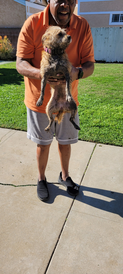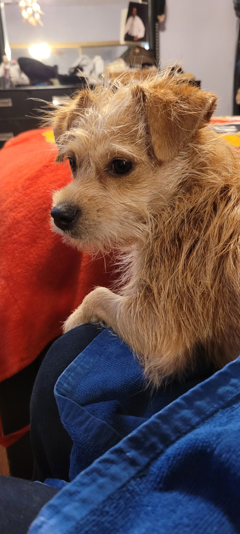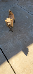 8 months terrier corky mix. Shaggy tan hair, lot of energy ,very playful. Love her human paw paw.