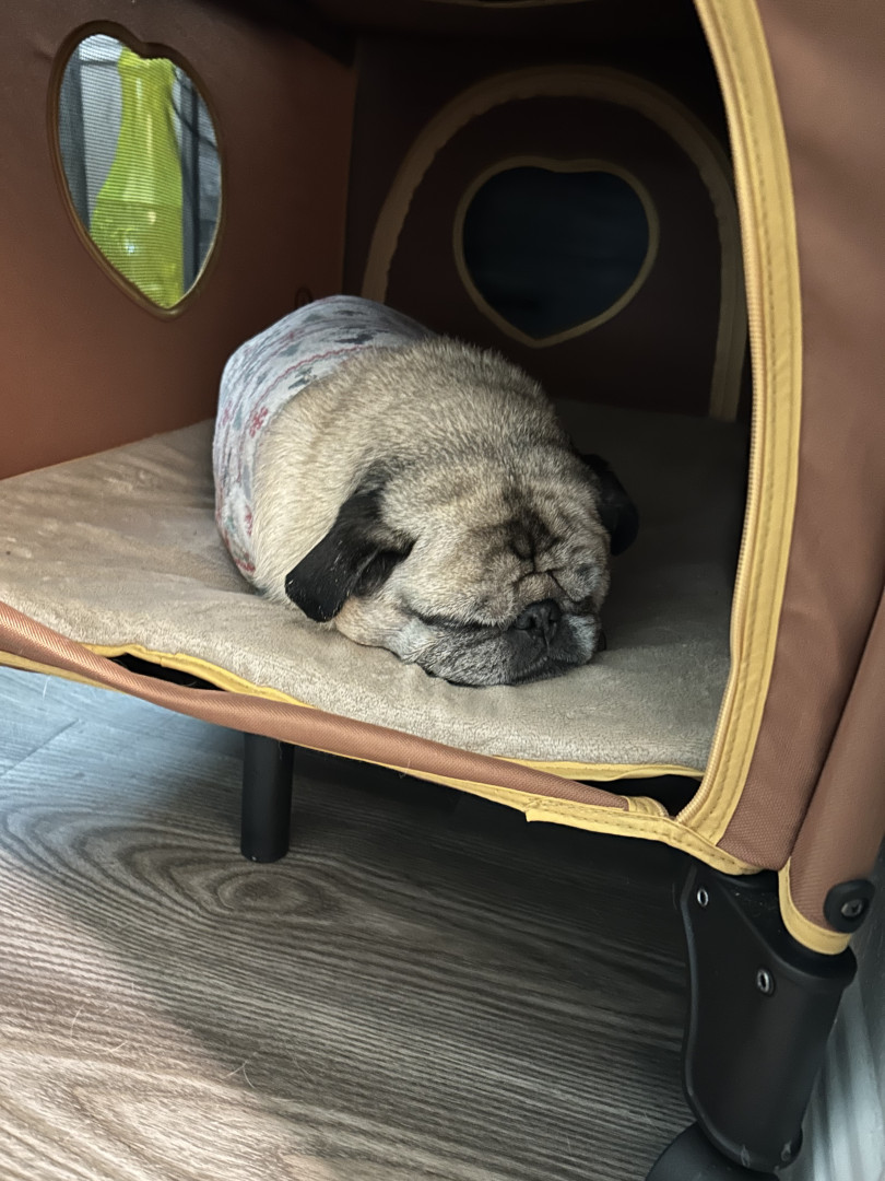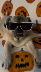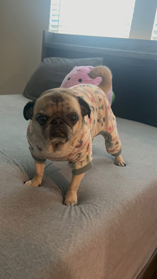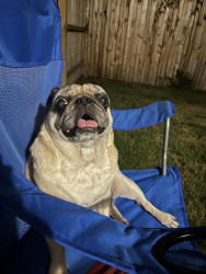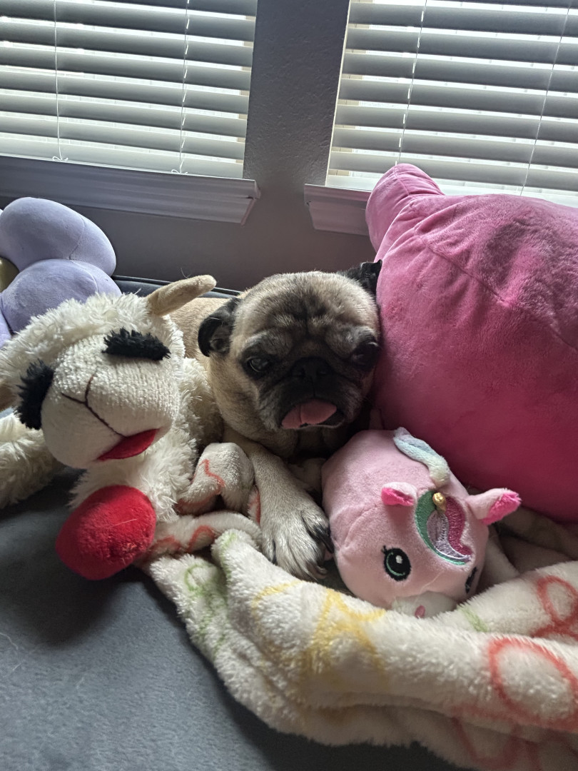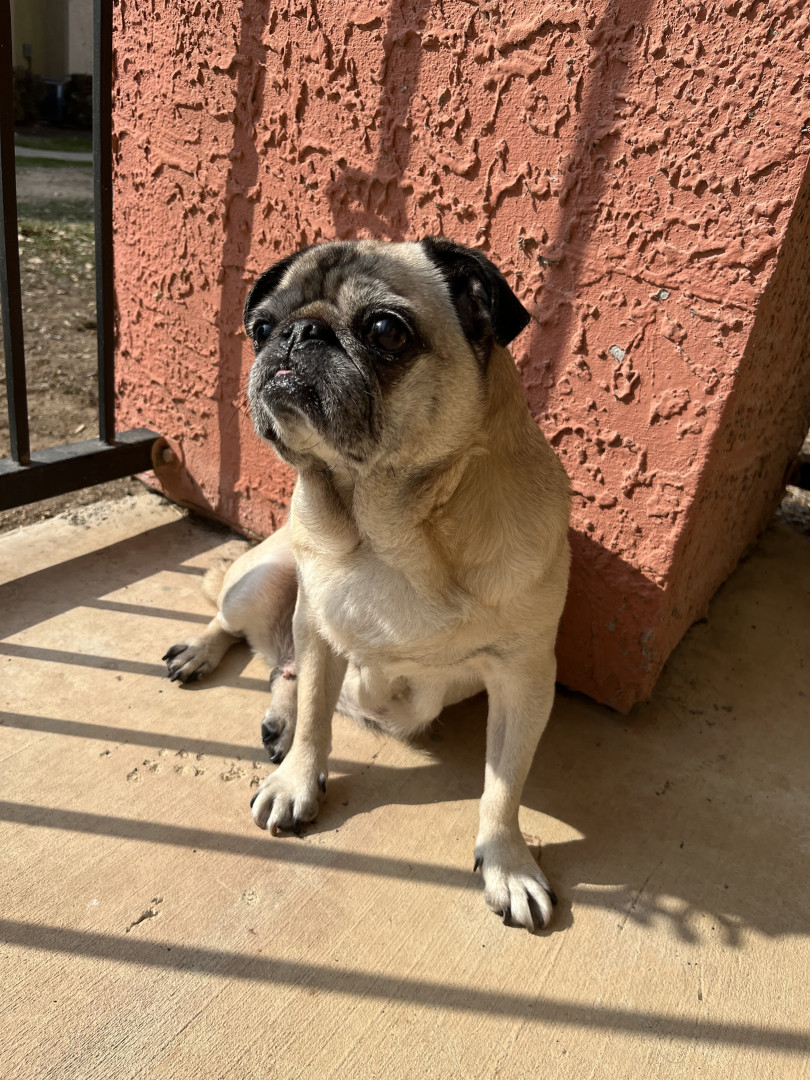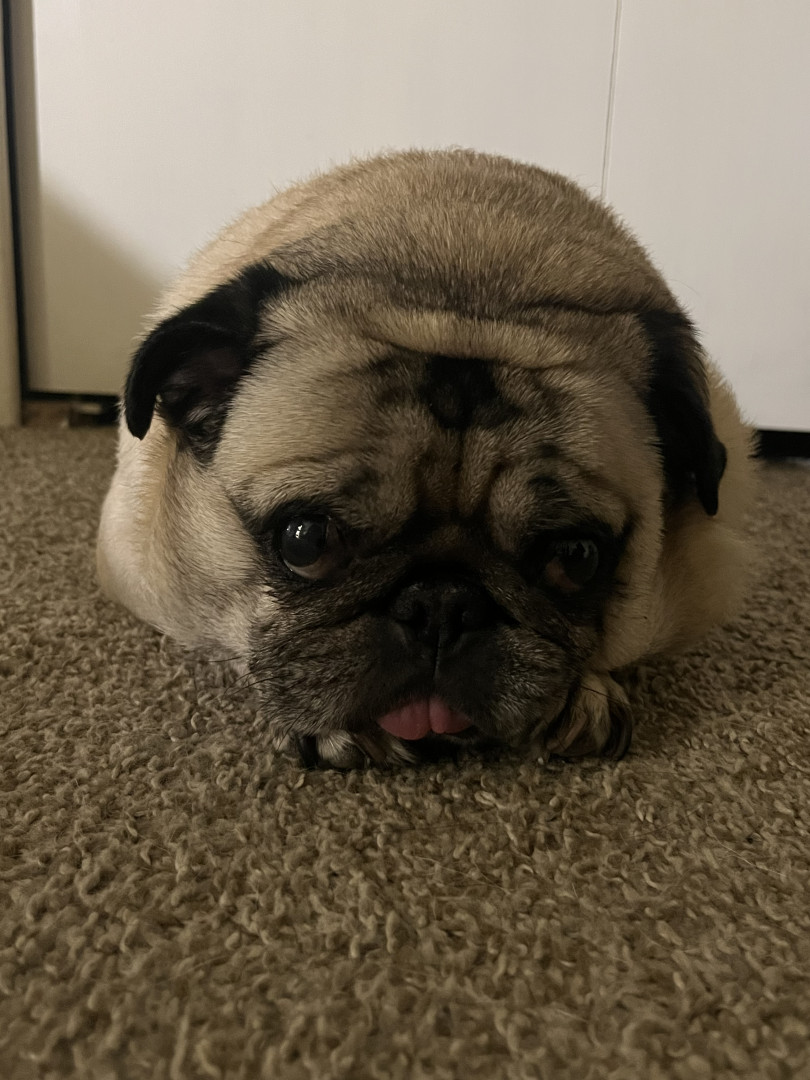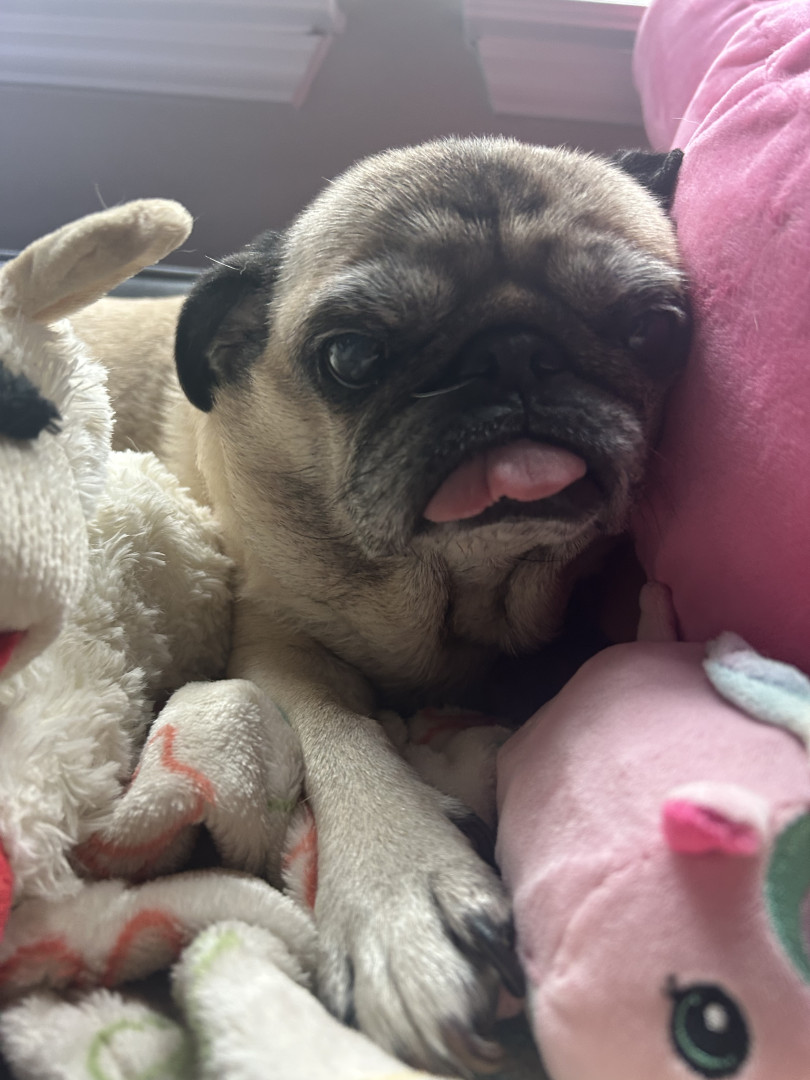 Lola is a chubby pug diva who lives for snacks, worships her dad, naps like it’s her job, watches TV, and takes squirrel patrol very serious