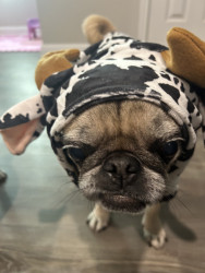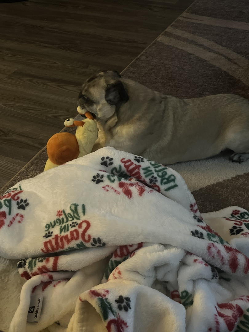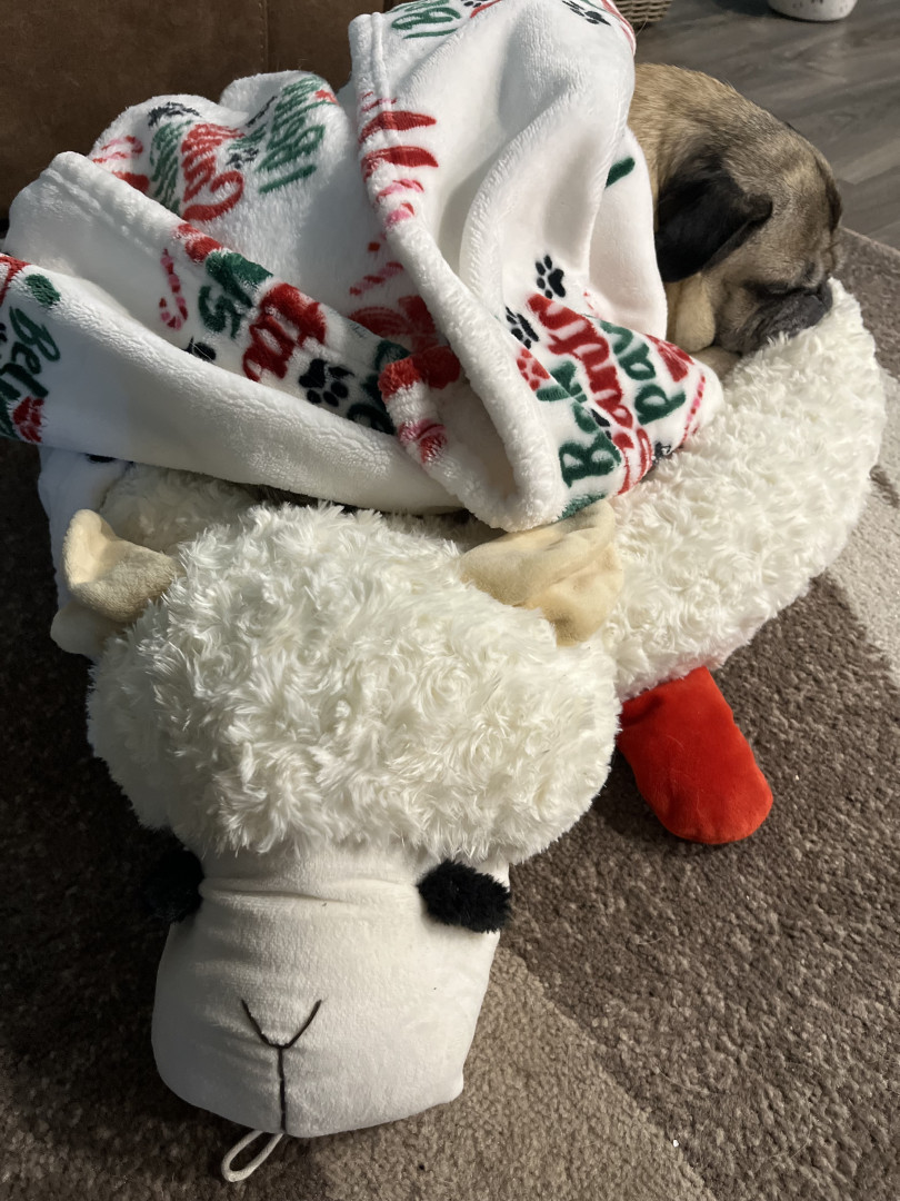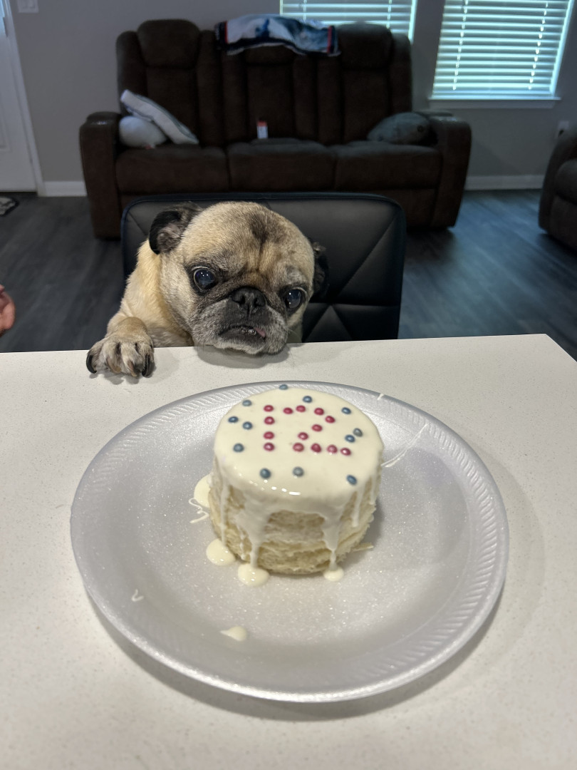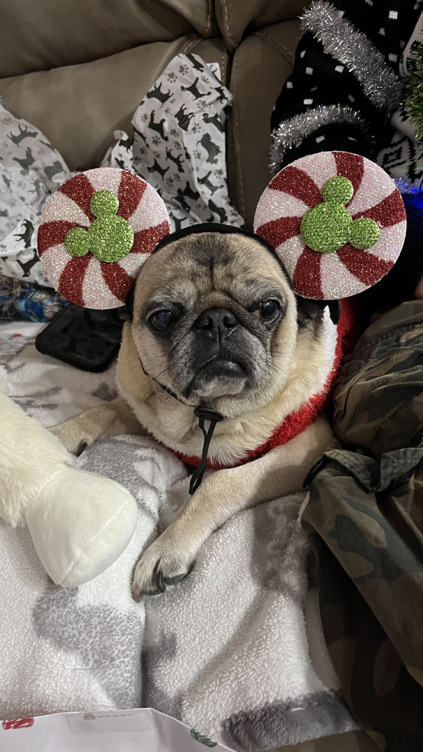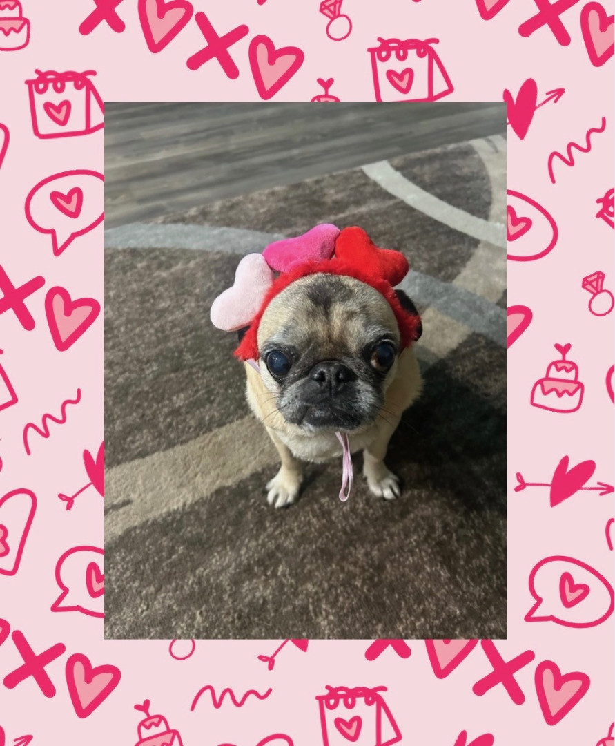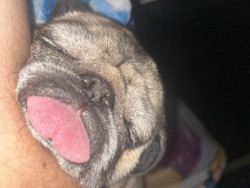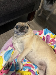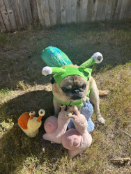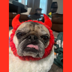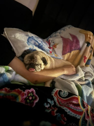 Lola is a chubby pug diva who lives for snacks, worships her dad, naps like it’s her job, watches TV, and takes squirrel patrol very serious