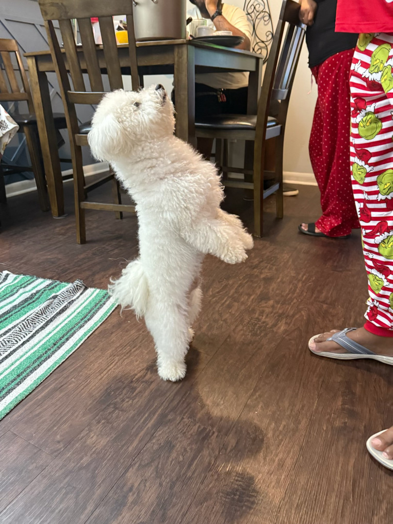 His favorite toy is a stuffed red and green Christmas pepper, but his all-time favorite is the big chicken he’s had since we first met. His favorite treat is a warm baked sweet potato with whipped cream—always cooked and warm. He can sniff out anything edible, right down to good old sweet potato pound cake.