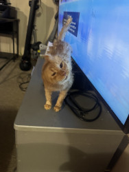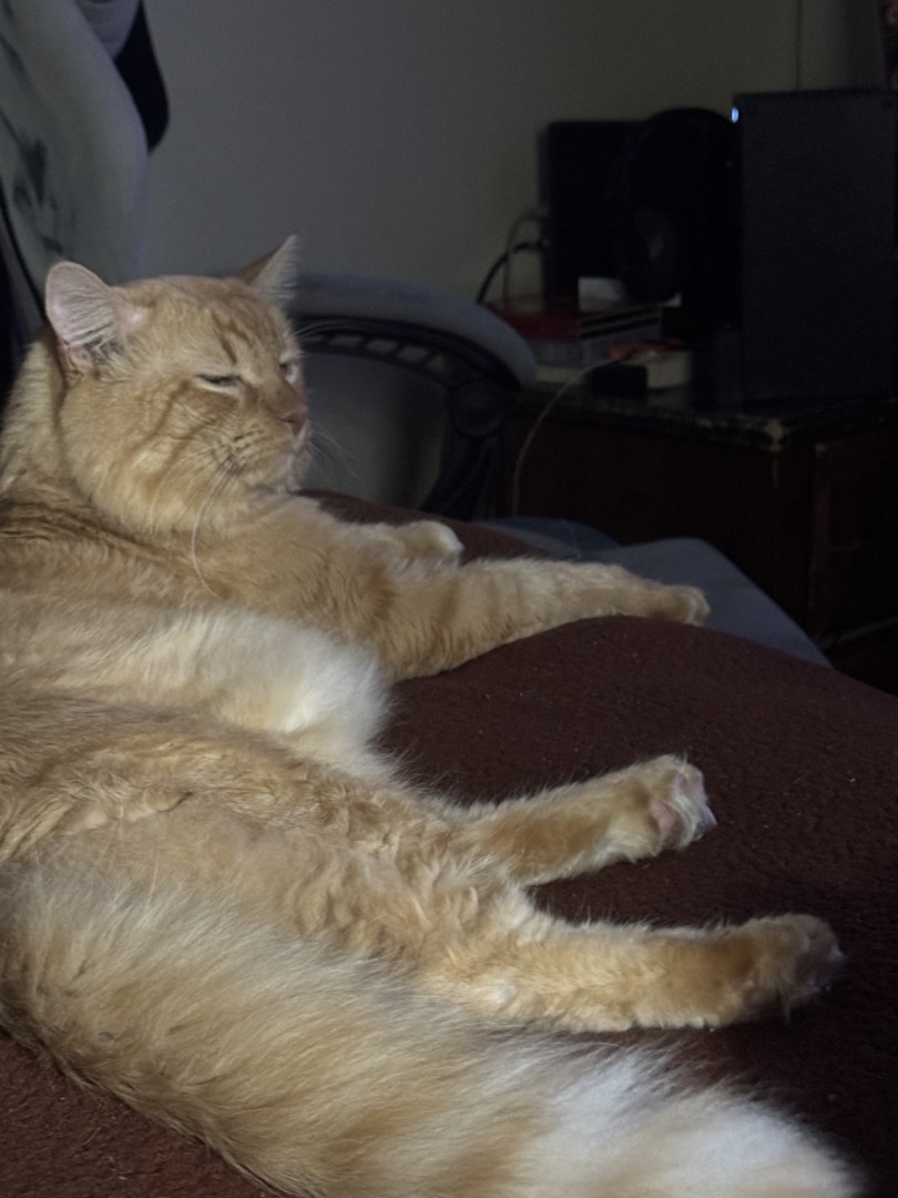 Lucky is a house cat he deep meows around the house an you can talk to him an he will meow, he lays around in funny positions
