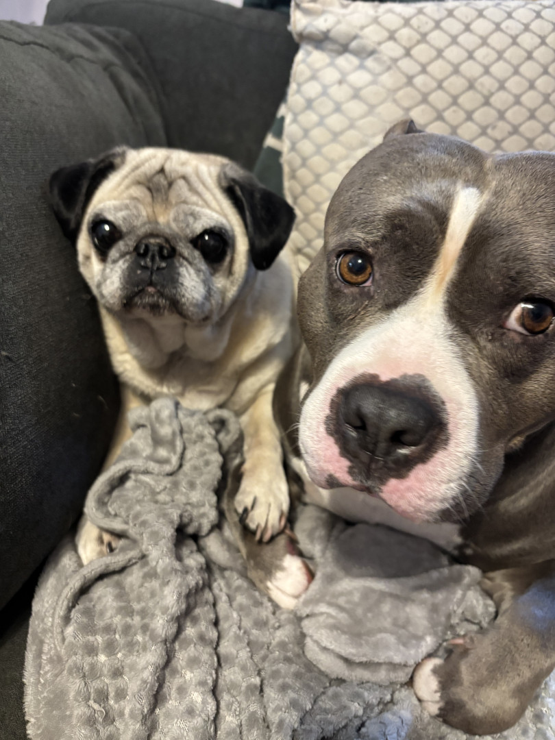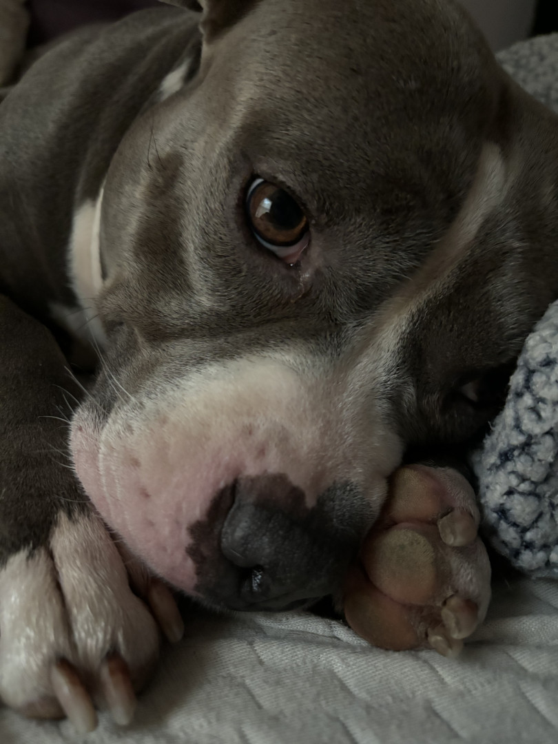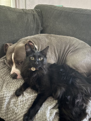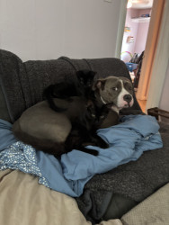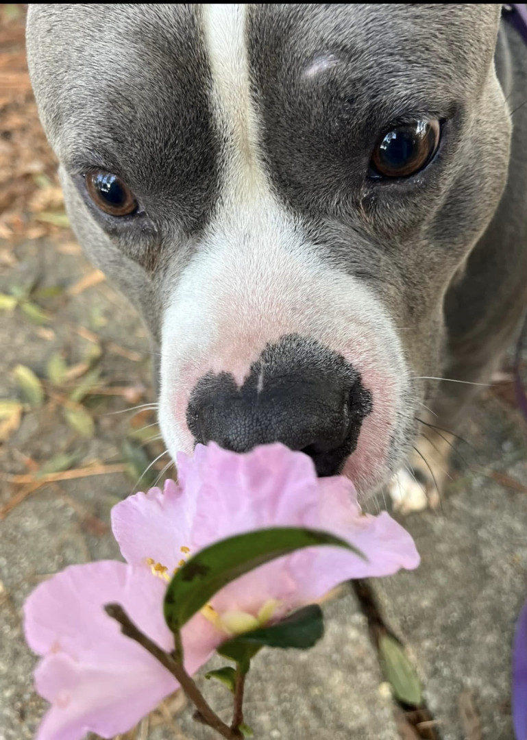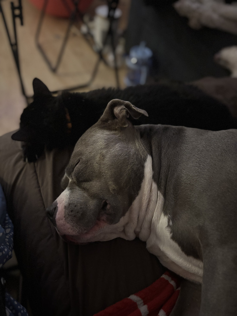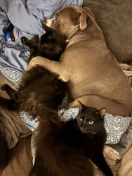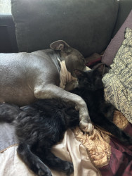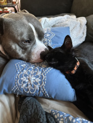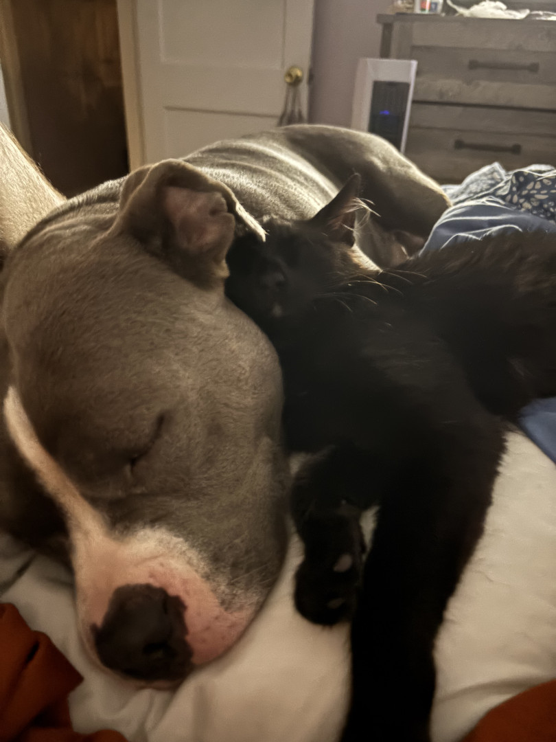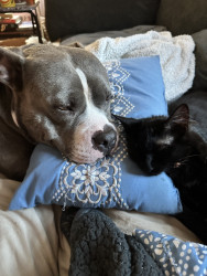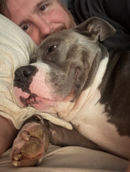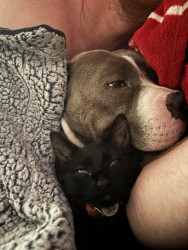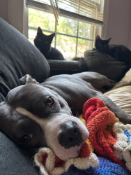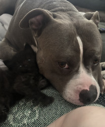 This heart nose pitty loves so much an he also loves his two kitties he rescued in a flood. He loves hard an is the sweetest thing in the wo