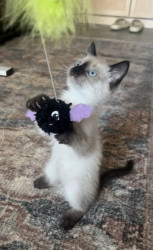 Lulu loves anything with jingle bells or feathers to play with, most of all he loves to play with your hand/arm under the blanket anytime of the day or night! He has quite interesting food requests. Hard food is too mediocre in his eyes, so soft foods and human foods is what he demands. Any kind of meat has his name all over it! Bacon, steak, ham, eggs, fish, he LOVES!! But we definitely can never leave bread or butter out because it will disappear into his tummy within 10 seconds!!!