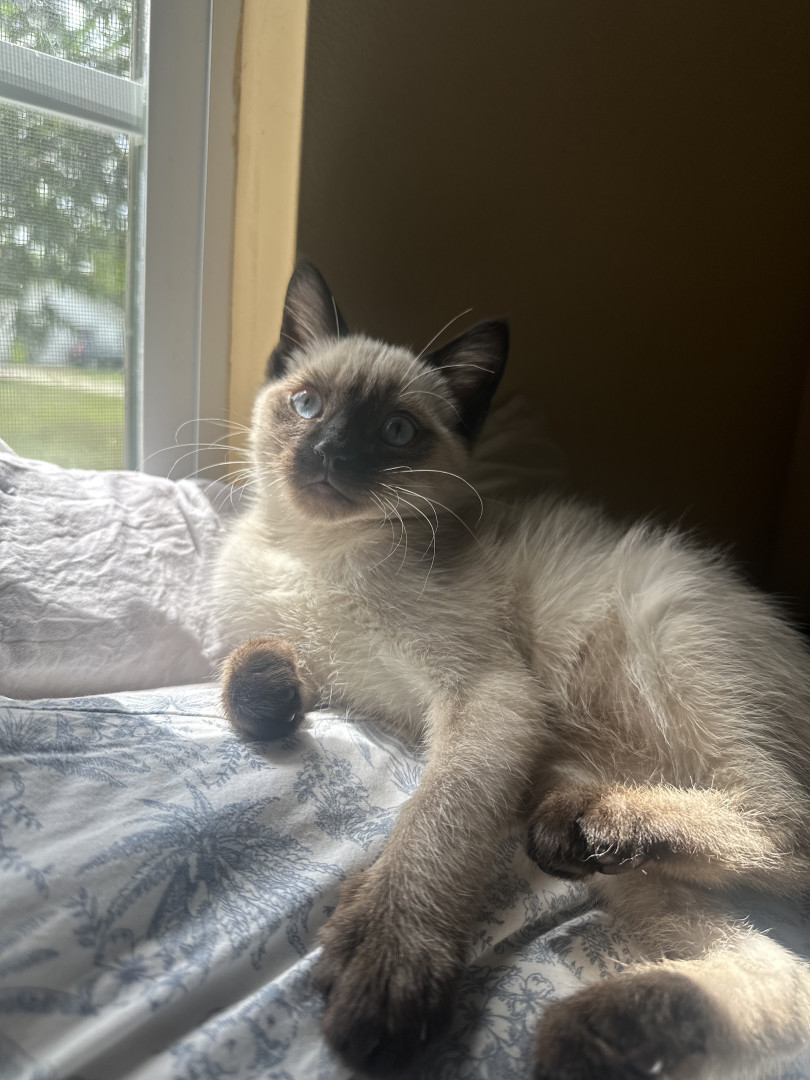 His most unique quality would have to be how he came to existence in this world. Lulu was born along with 4 siblings but he looks nothing like his brothers and sisters. LuLu is a product of a pregnancy within a pregnancy, where the mother was impregnated twice by two different males, born from a taby mom all of his siblings are black or taby while LuLu is the only Siamese in the liter♥️ I think he knows he was different from the day he was born but if anything it only made him feel more royal!!