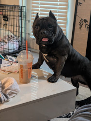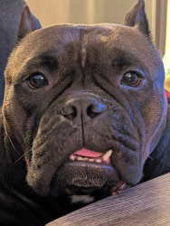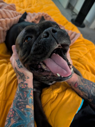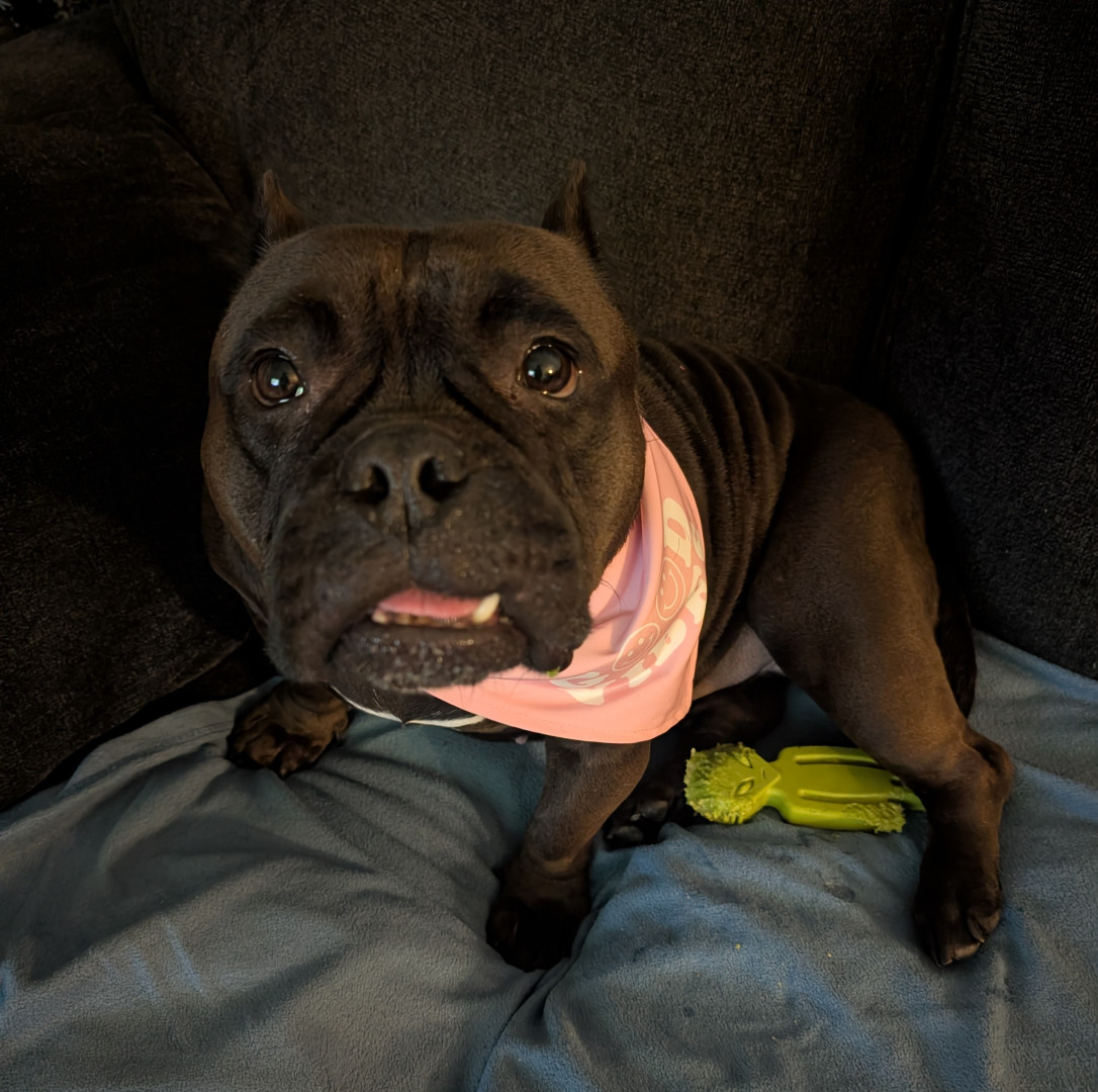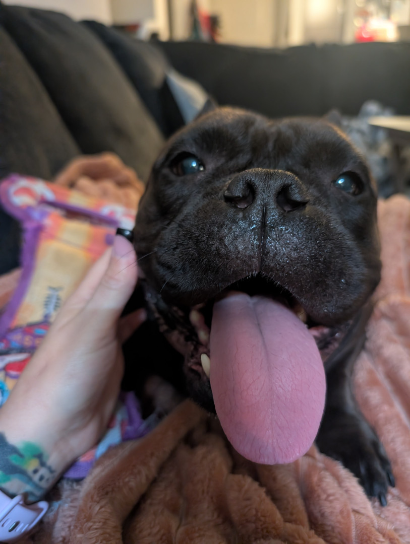 Luna is a smooshy, lovey little meat sack, adopted at 6 years old after being abandoned, she's our noisy little gremlin