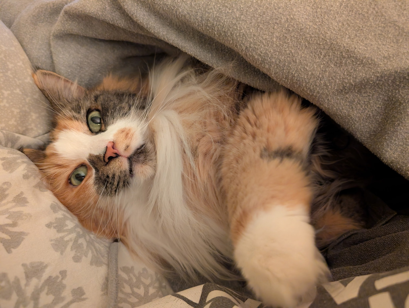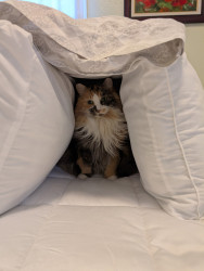 Luna is a very loving cat and if you make a lap for her she is on it! She LOVES cuddles. She also crawls under the covers when it’s cold out and will sleep right on you for extra warmth. Luna also has a wild side including jumping on the dining room table and then climbing in a grocery bag and falling off the table because she couldn’t see. She also likes to mess with her dog brother, Garrett, and chase him around. Garrett is unsure about this development. Luna has a huge personality!