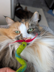 Learn MoreHer favorite toy is a little fluffy snake that you may have seen her wearing as a mustache. This was a recent birthday present for her and she loves to lay on her side, holding the snake in her mouth and kicking it with her feet. She thinks she is very vicious but really she just looks adorable!