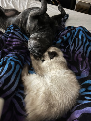 Loves car rides, fluffy, vocal, lovable, playful, funny, has a frenchie bro, thinks he’s a dog. He plays fetch and runs to the door, etc