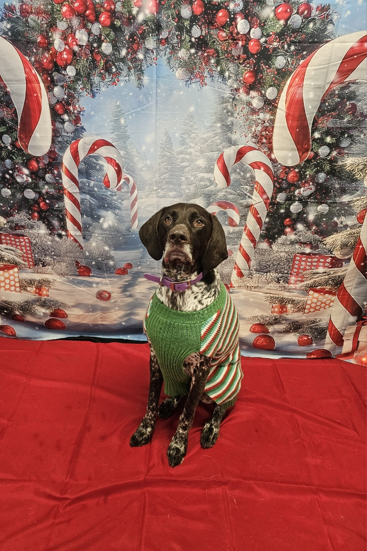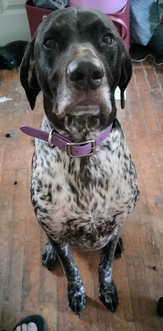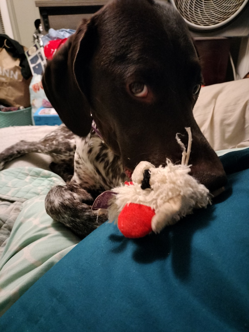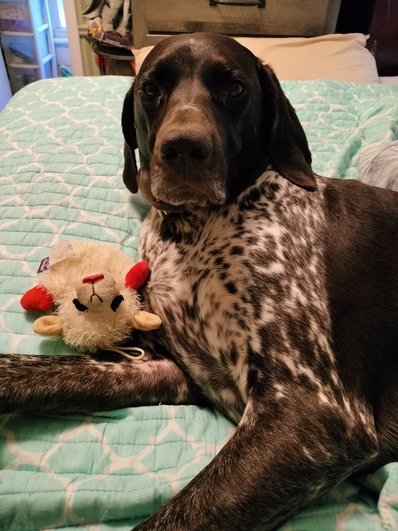 Lyric is a sassy, sweet GSP. Her personality shines through when she hugs you. She talks back like a teenager, throws her toys, & is my ❤️