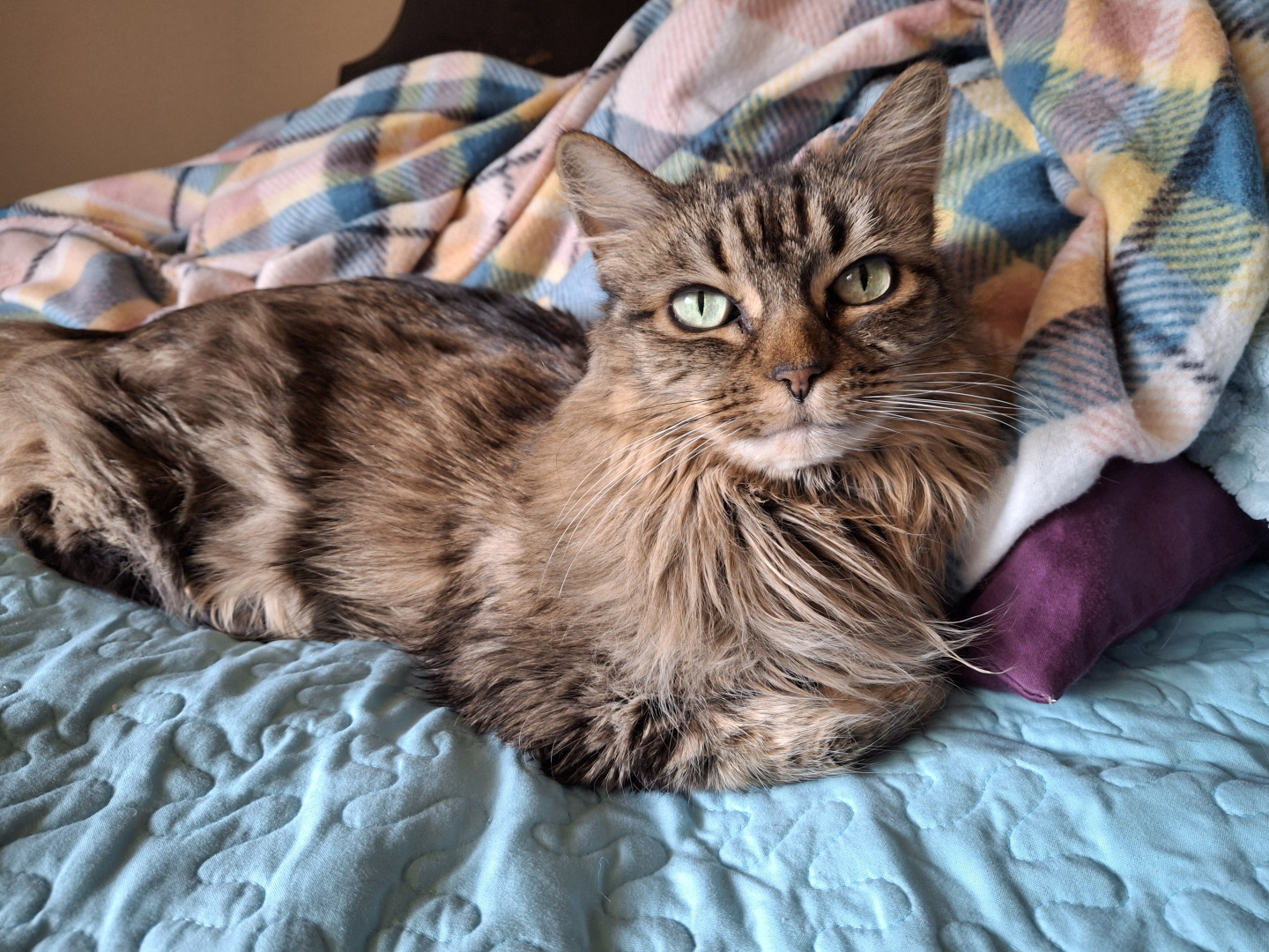 She is a Maine Coon mix. She loves to talk a lot. She sleeps next to my head. She uses the toilet and loves to fetch hair ties.