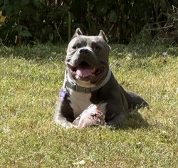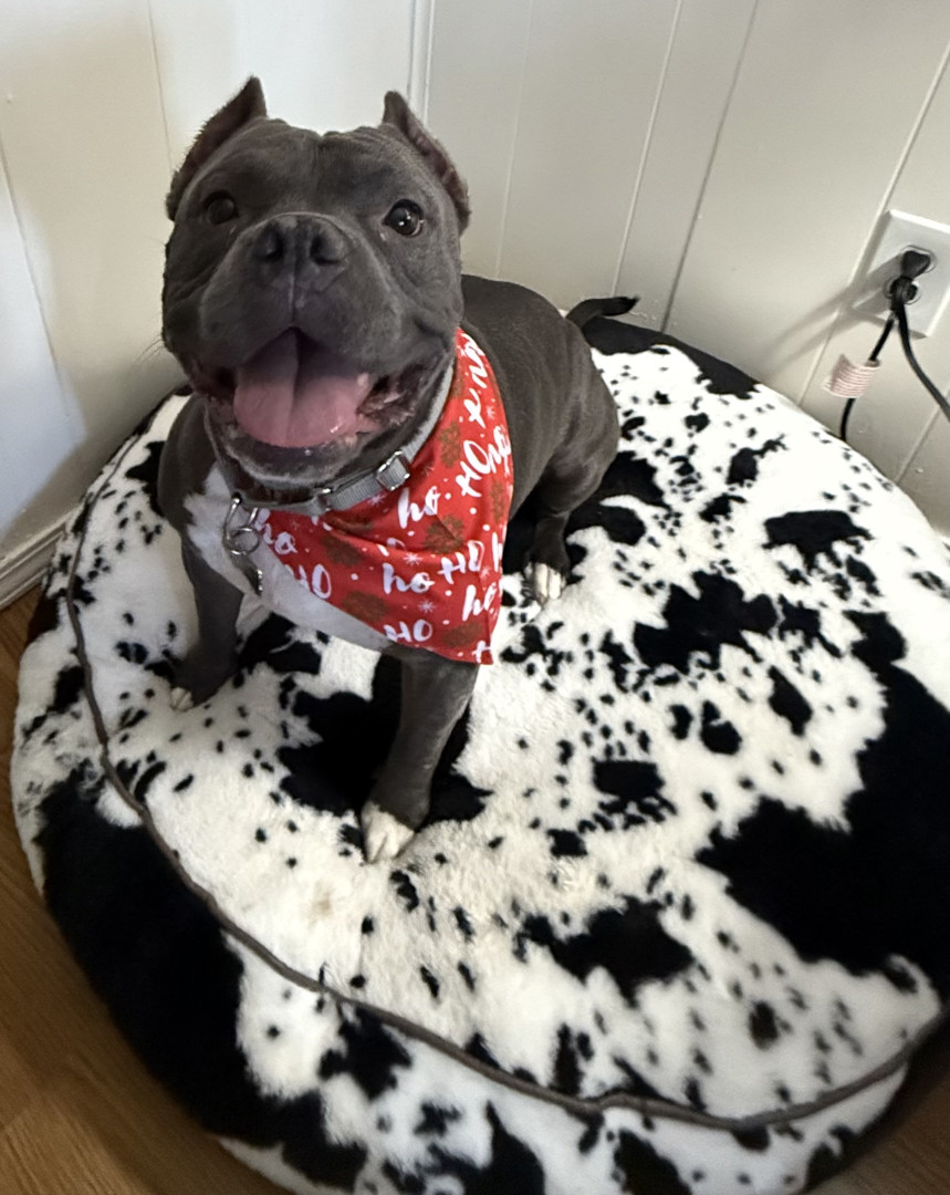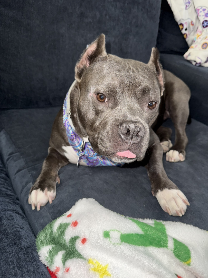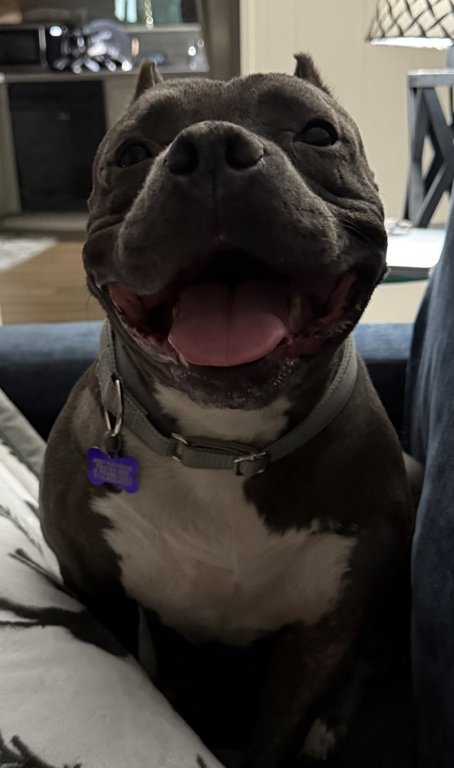 We rescued her from a shelter just a few short months ago after she was attacked in a foster home and she has fully recovered from her battle wounds and made the best bounce back! She is so full of personality and has the kindest heart and just wants to love and kiss everybody! When she isn’t chasing balls she is cuddled up next to me or my son napping. We love our little baby hippo and everyone else who meets her does as well!