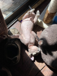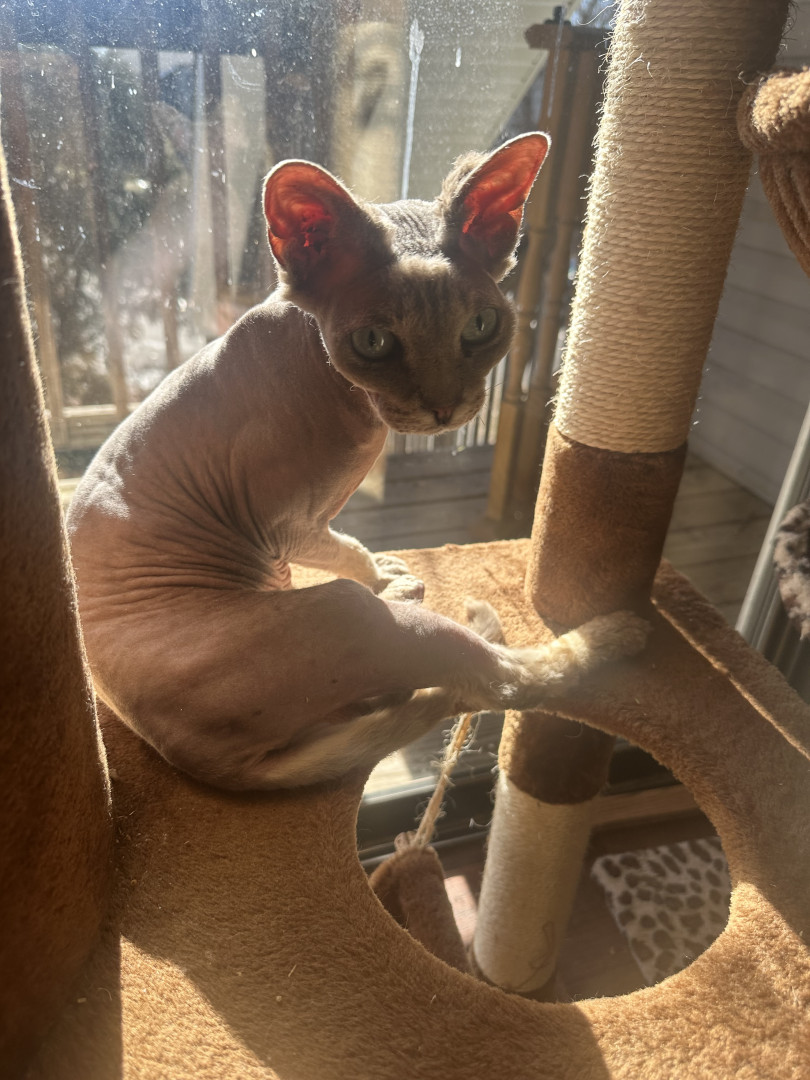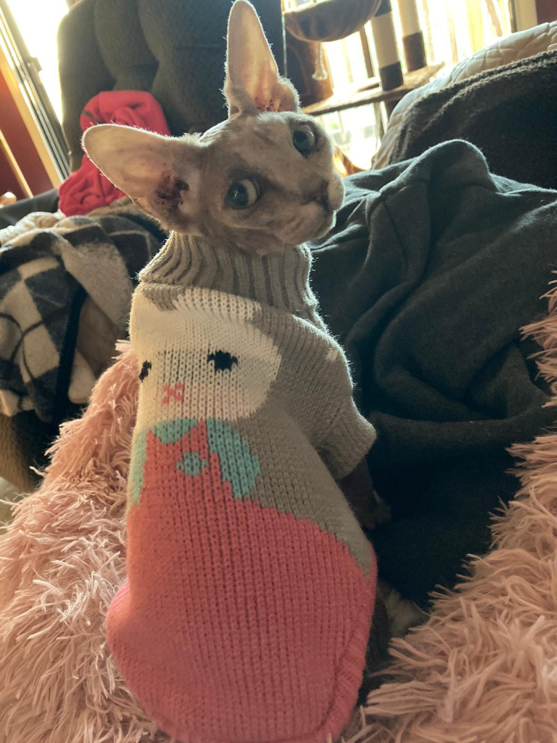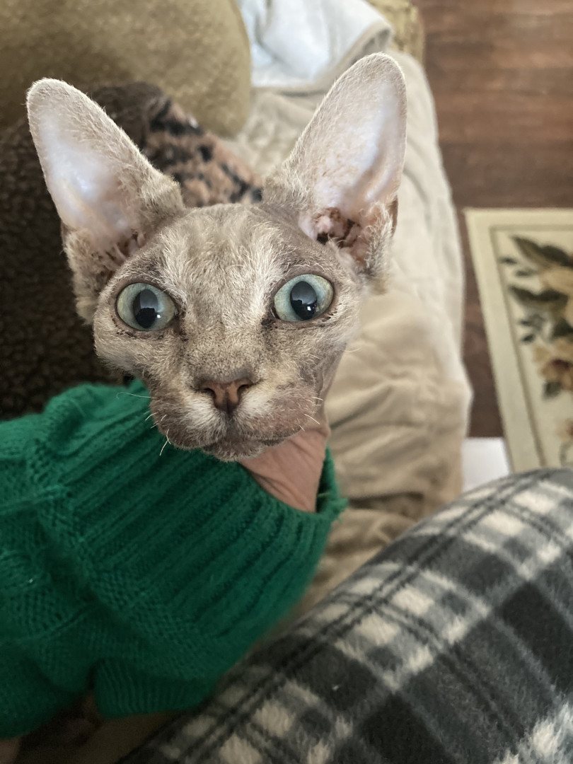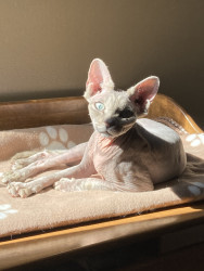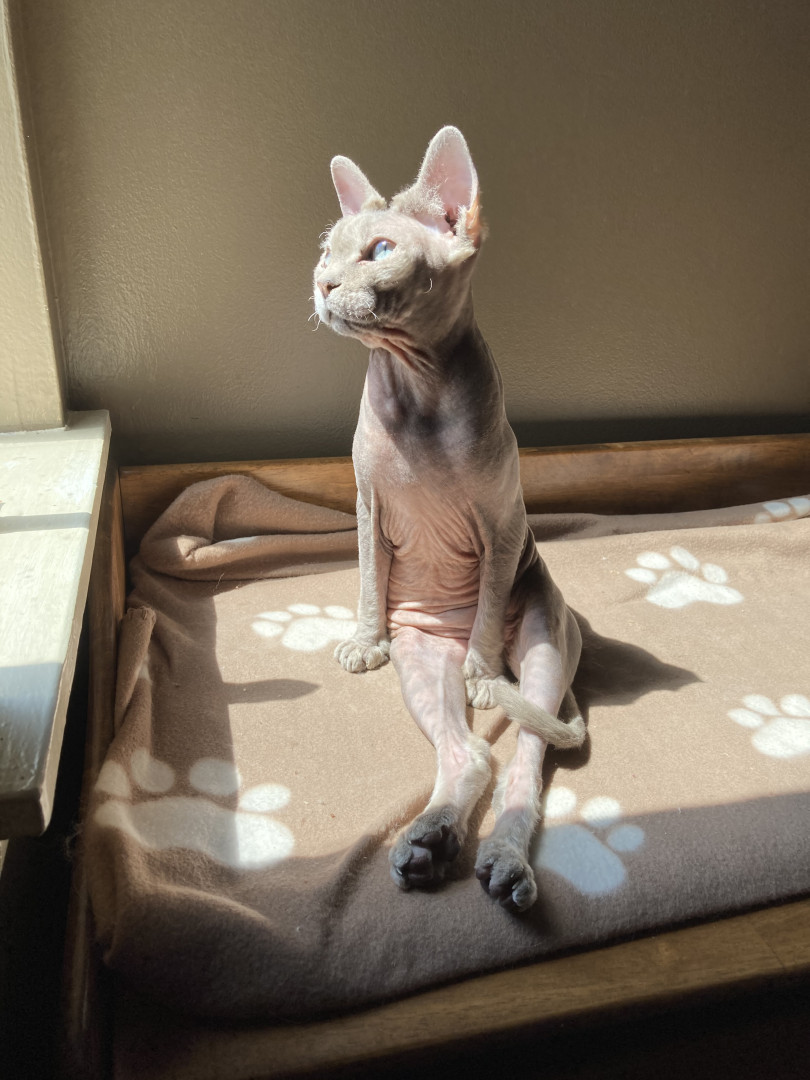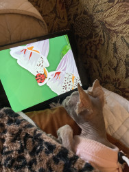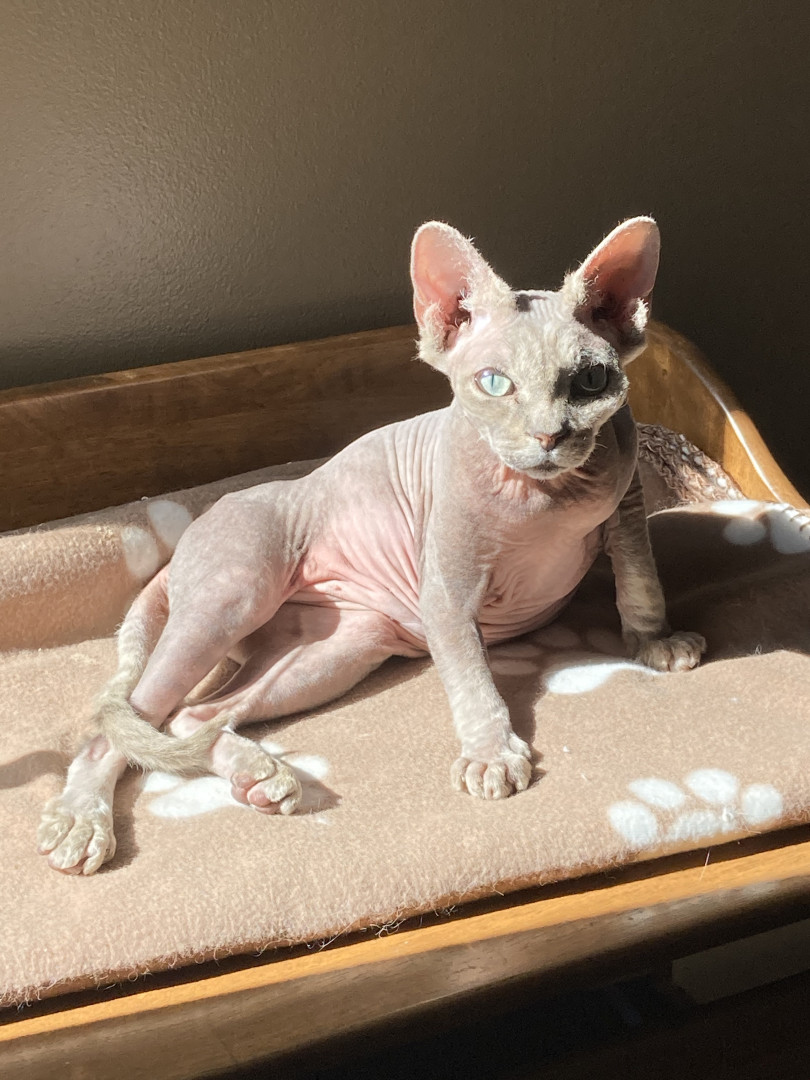 Maeve is a personable, beautiful Sphynx mix who loves playing on an iPad and sleeping on electric blankets to keep warm.