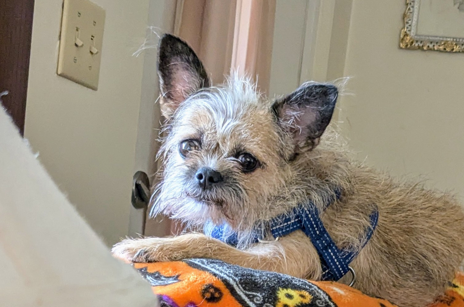 Maggie Mae is a Chihuahua/shitzu mix. She is 6 years old and weighs in at a whoping 8lb.8oz. She is a great watch dog.