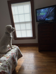 Maggie watches TV & she’s obsessed with live squirrel videos. She & our little shih tzu, Lucy, were adopted off the streets