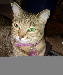 Mahina has many unique qualities. She is very smart and loves to hunt when she is outdoors. When I found Mahina she was in an old tire abandoned by her Mama she was only 6 weeks old she was dirty,hungry.I waited for awhile but her Mama never returned. I wrapped her up and brought her home wiped her up and fed her she ate up her food drank some water and fell asleep cuddled up with her pink bunny. There was a full moon that night so I named her Mahina which means Moon in hawaiian.