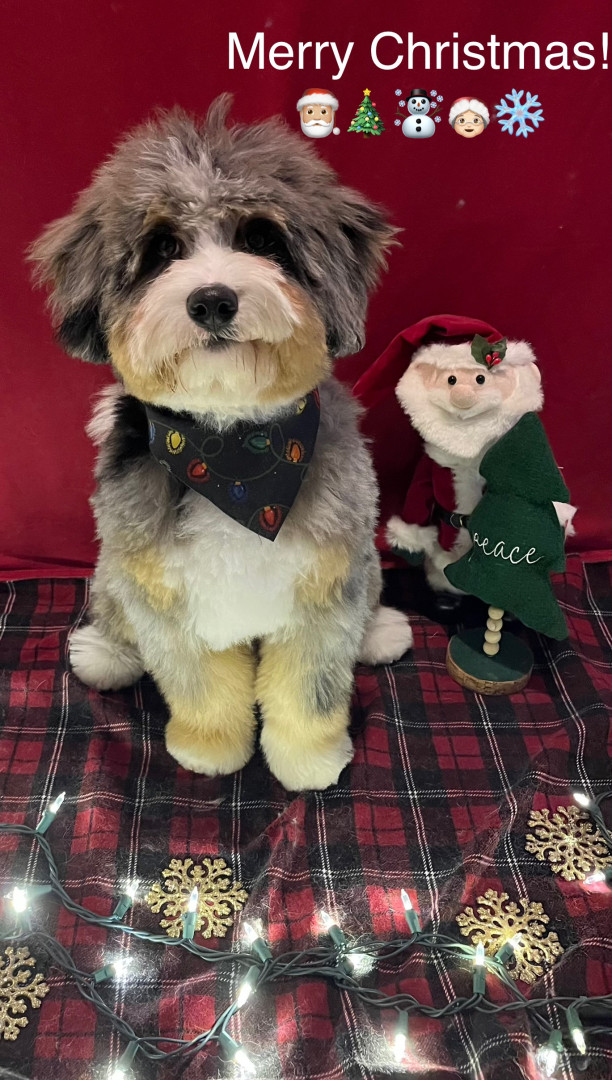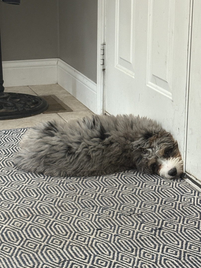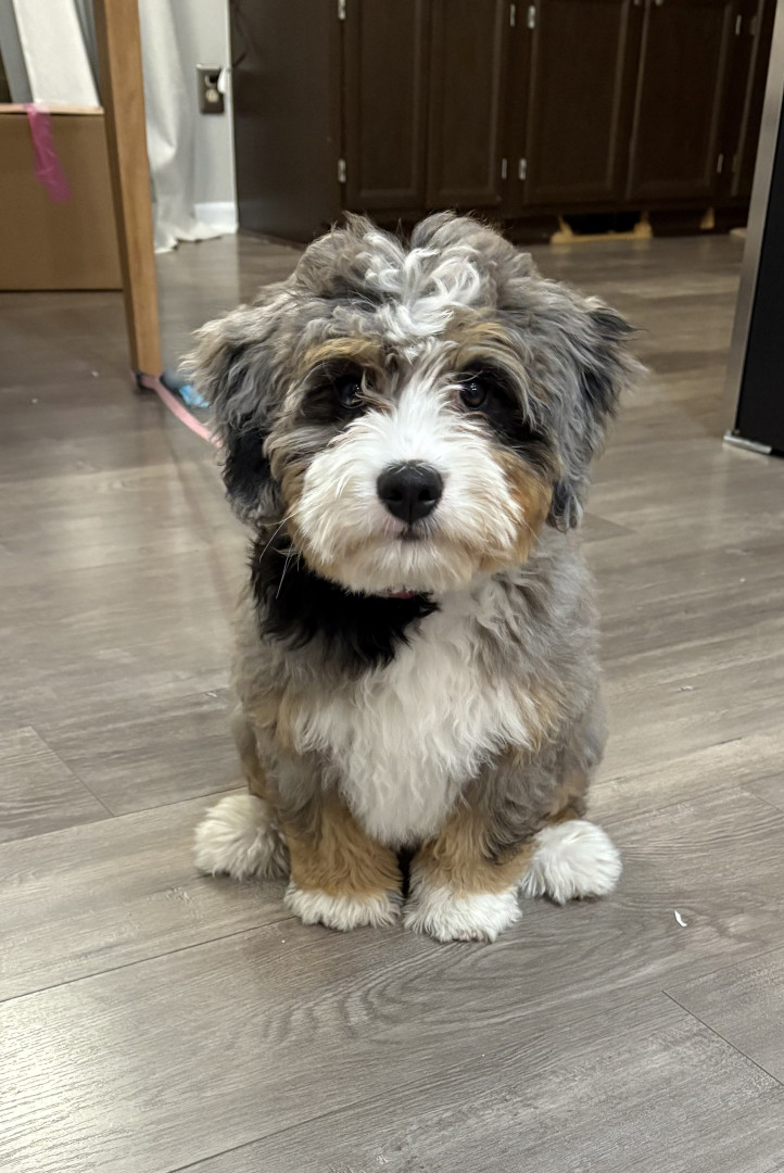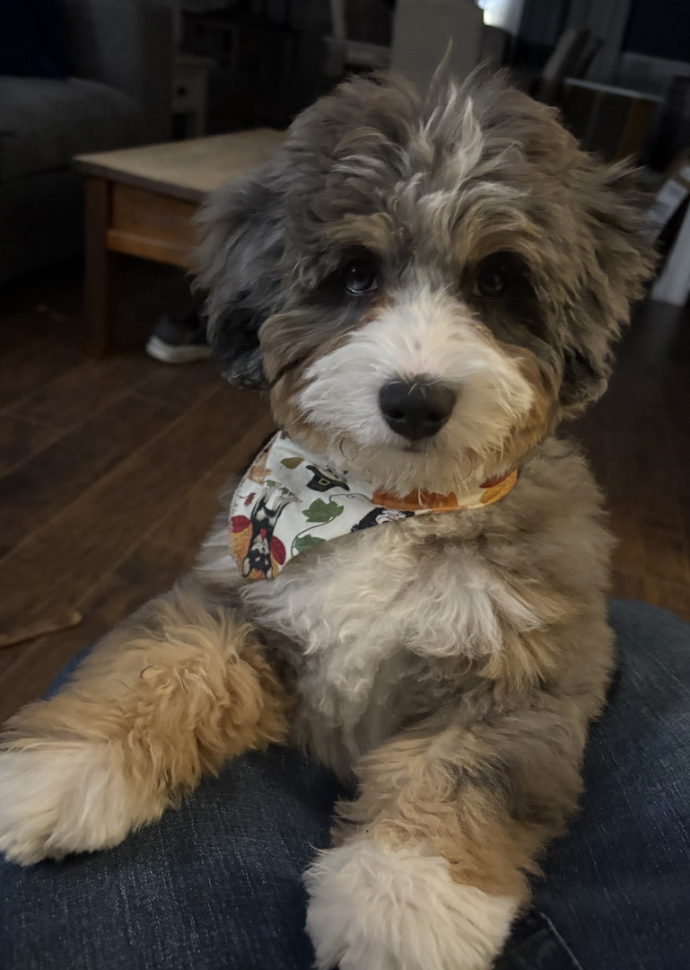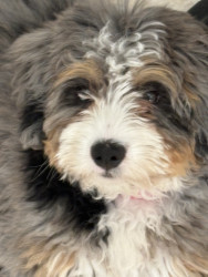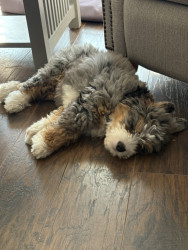 My pet is a beautiful F1 mini Bernedoodle. She is 50% Bernese Mountain and 50% poodle. She has a great personality and is a fluffy goofball.
