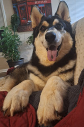 A huge baby, loves kisses and hugs, always ready to play ball, very protective of his mom, lovable and with a heart bigger than him.