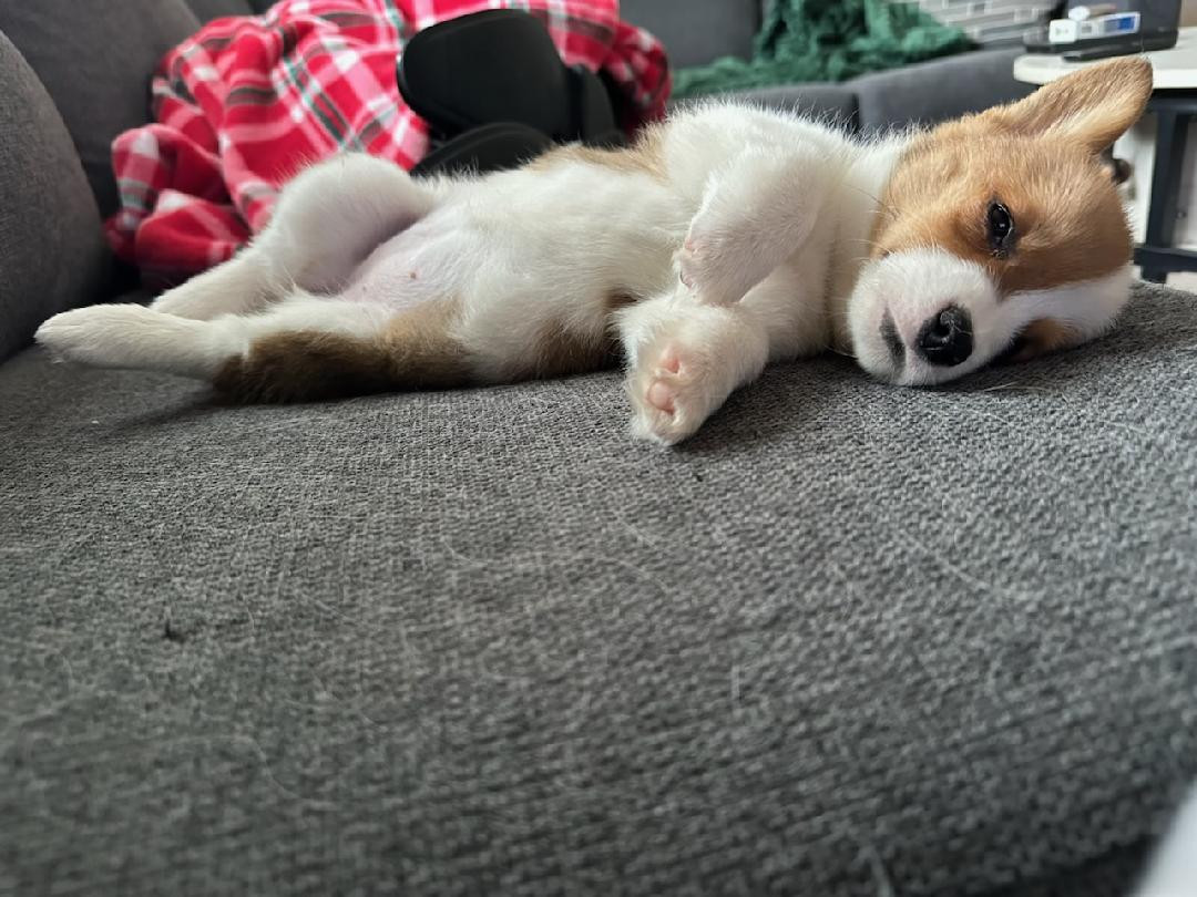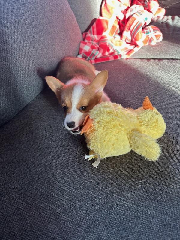 Maple is getting used to her new surroundings and has been an amazing puppy. She sleeps through the night in her crate and loves playing with her Corgi sister and pawrents.
