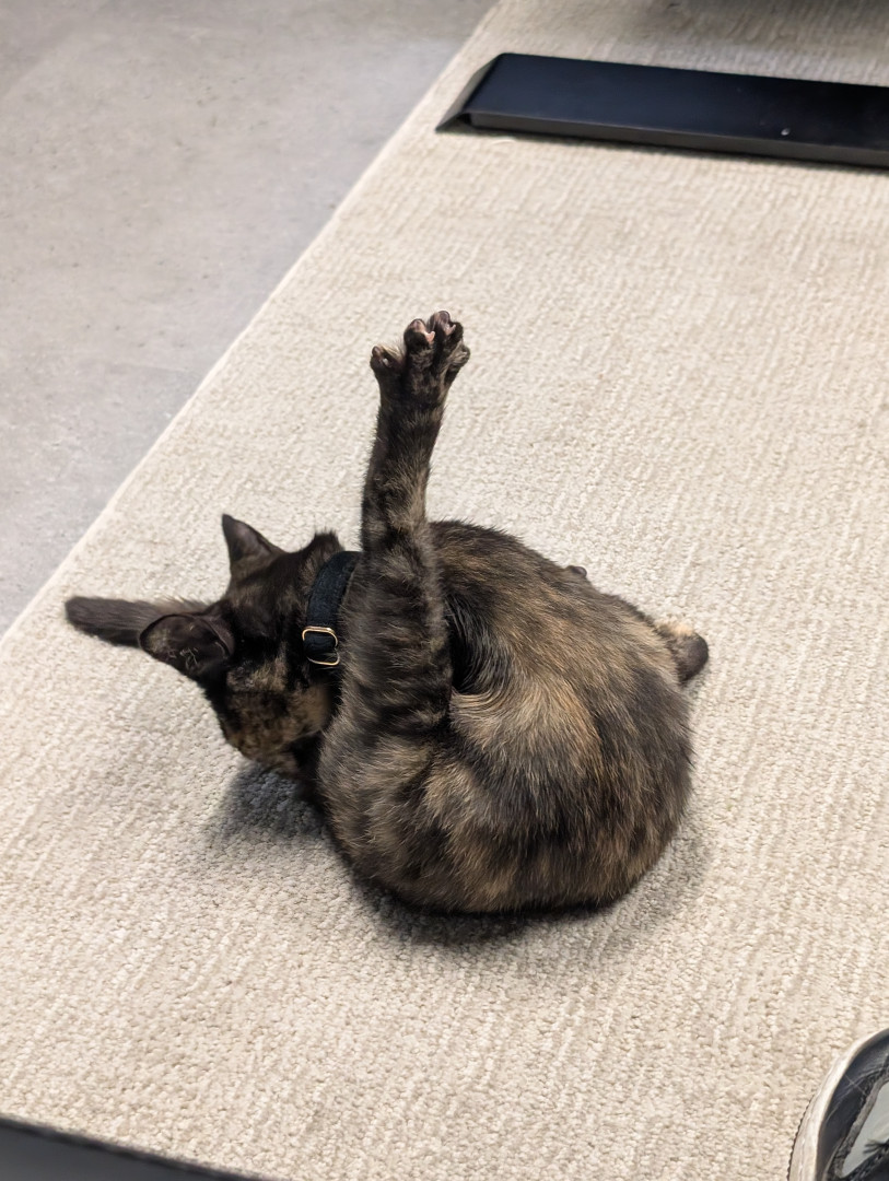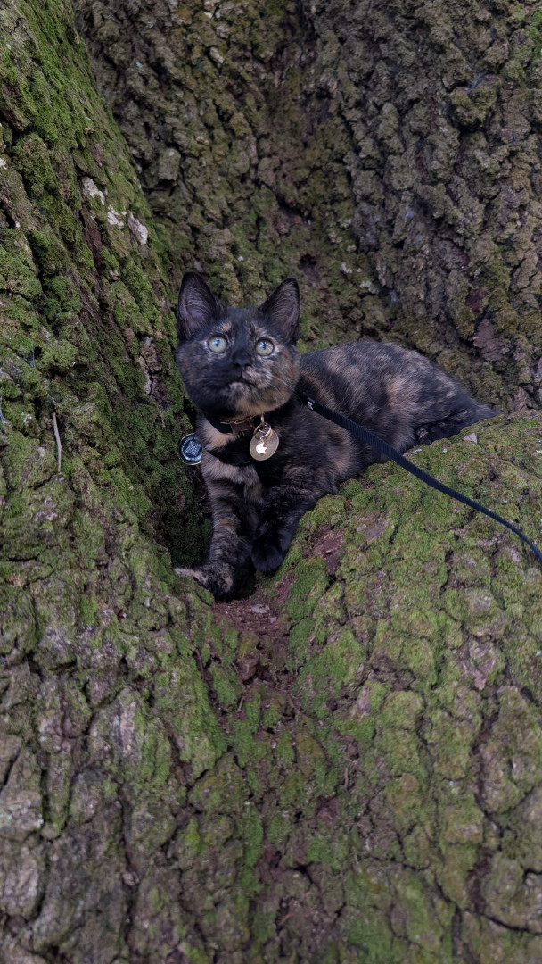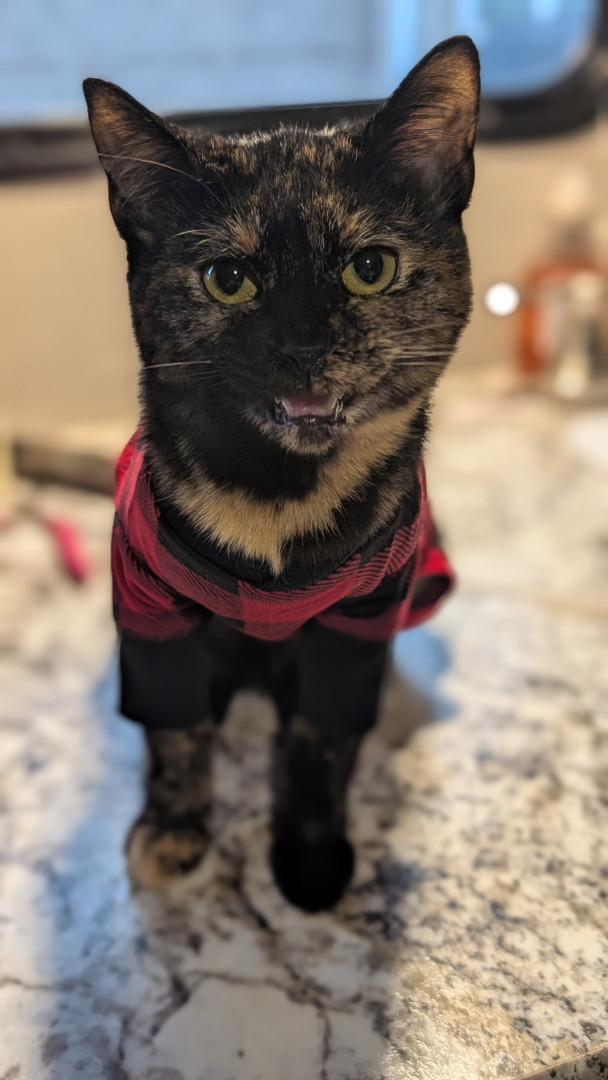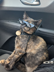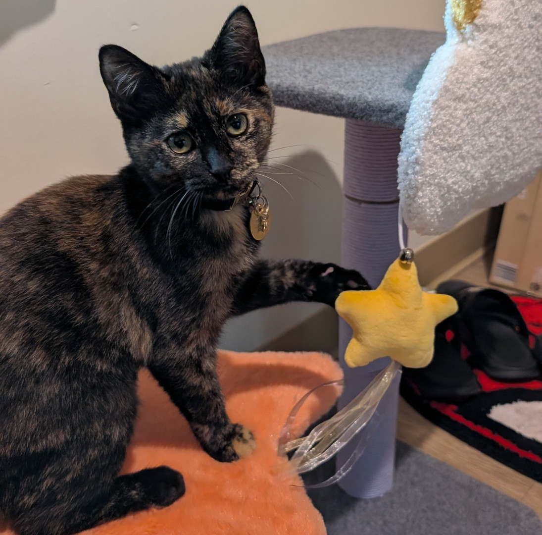 Born on May 4th, 2025, Marcy is an 8 month old tortoishell kitten. She weighs almost 6 pounds and has boundless energy to spare!