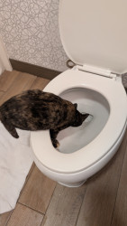 Her absolute favorite toy is stealing hair ties from anyone and everywhere and flicking them around the room to chase or play fetch with. Her favorite treats would have to be squeezable packets of chicken based kitty treats.