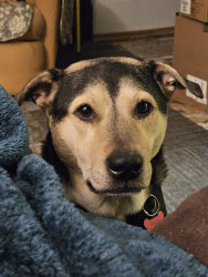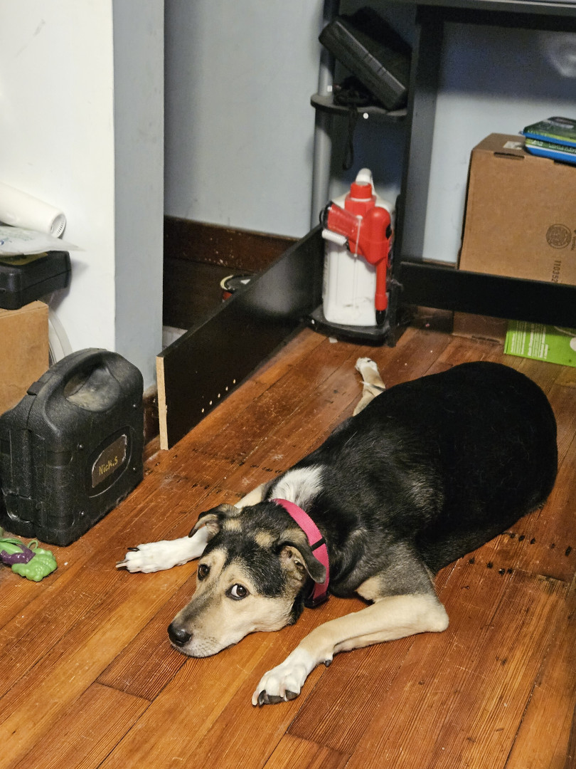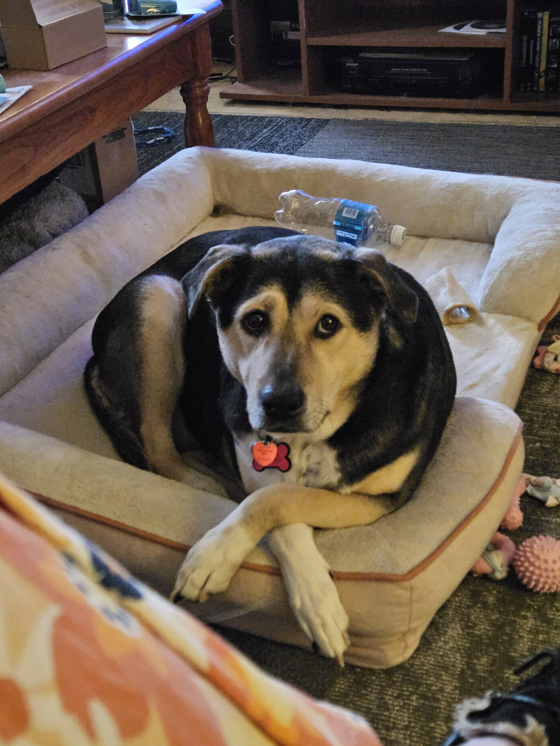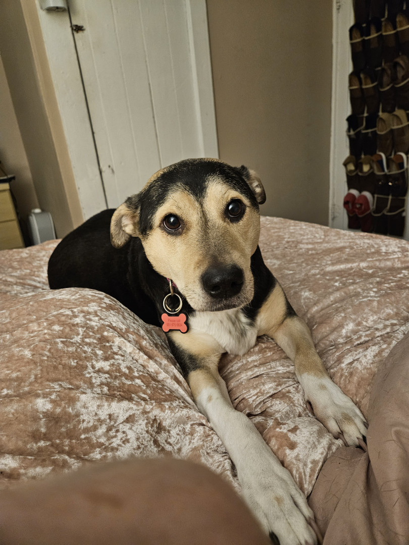 Beagle Shepherd mix, food driven, loves her humom so much she jumps up and down when she gets home. She is sweet and smelly. Cat hates her.