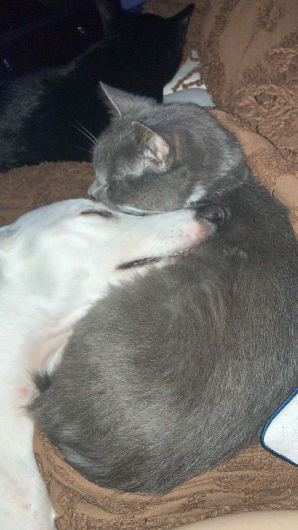 When I take her to work with me (a doggie daycare) she loves to run up to other dogs to play. However, she gets overly emotional and barks at them instead of initiating play. Additionally, she shows many cat-like characteristics, like loafing, biscuiting, and chasing string. This probably stems from her having six cat siblings!