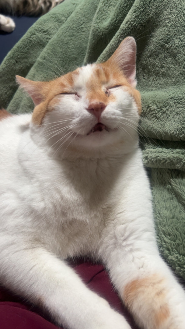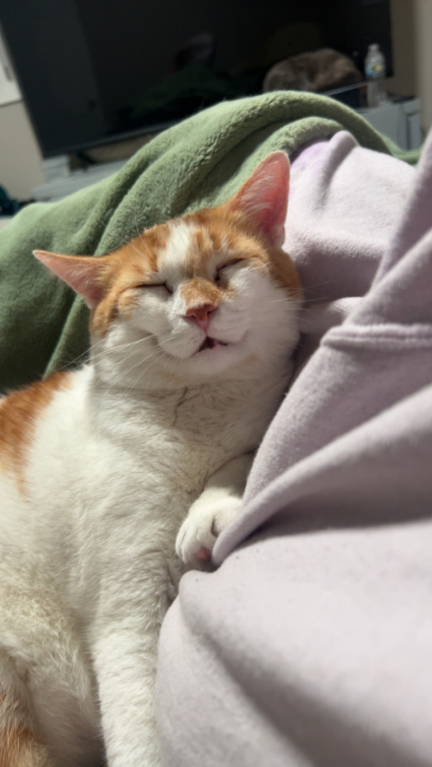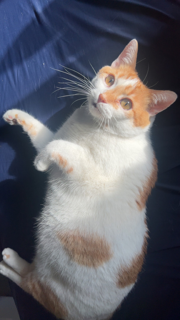 Mr.Mans is one of the (if not the most) happiest, sweetest, caring, quiet, goofy, and snuggliest cat you’ll ever meet. He’s like the Keanu Reeves of the house, you just love him! He always brightens up any kind of day, especially when his silliness comes out. You can scratch his butt and it’ll make him lick, rub his chest and he’ll hug your hand, stop scratching and he’ll hold onto you hand/arm for dear life, and also the cute, silly faces he makes when you pet him right. So grateful for him!