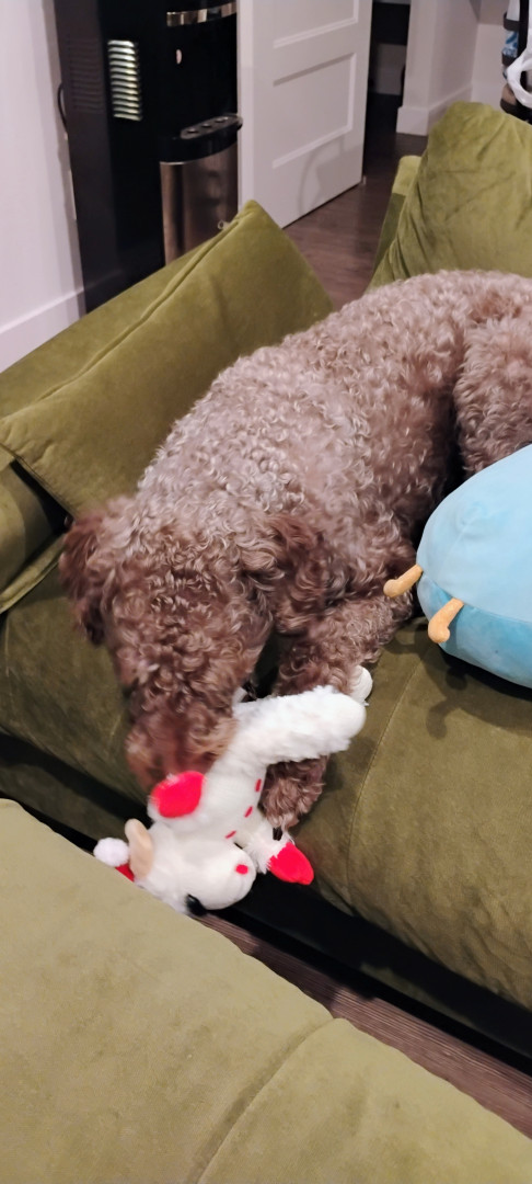 Receive Text UpdatesHis favorite toy is a stuffed white lamb that squeaks. His favorite treats is anything that I'm cooking with, he loves fruits and veggies along with some ham and chicken.