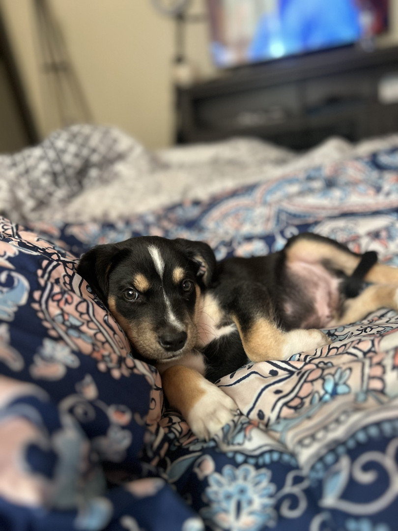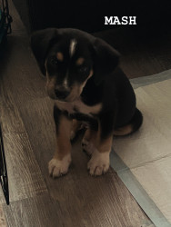Mash’s most unique quality is his coat. He is black, white, and tan, with spotted feet.