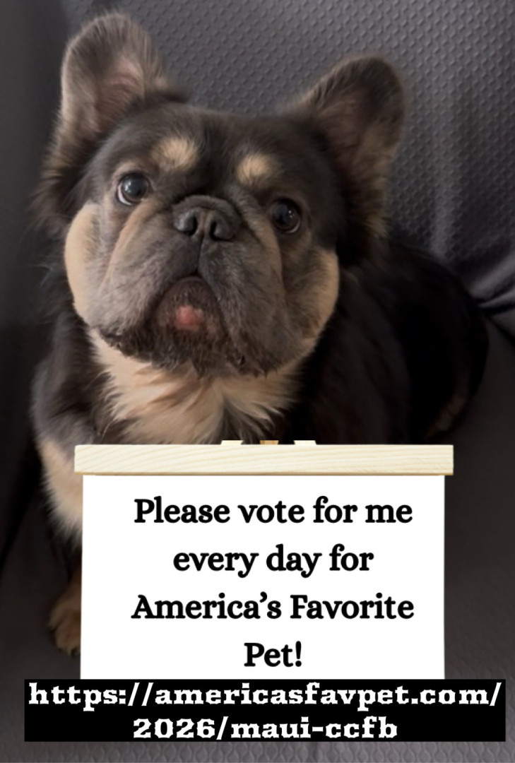 Maui is our very handsome Fluffy French Bulldog. Help us share him with America by voting him as America’s Favorite Pet by voting every day.