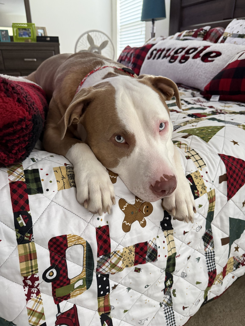 He is the biggest cuddle bug! He loves kisses on the nose. He sleeps on our bed at night & can’t get close enough to one of us every night.