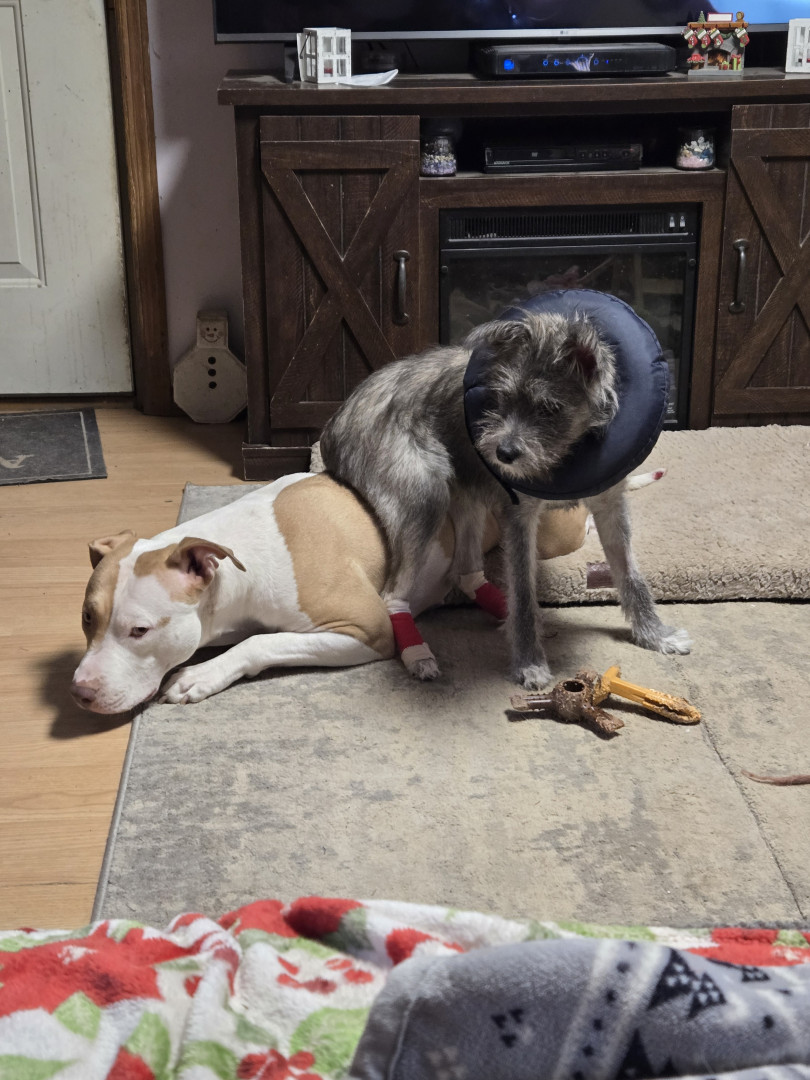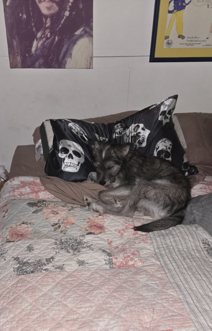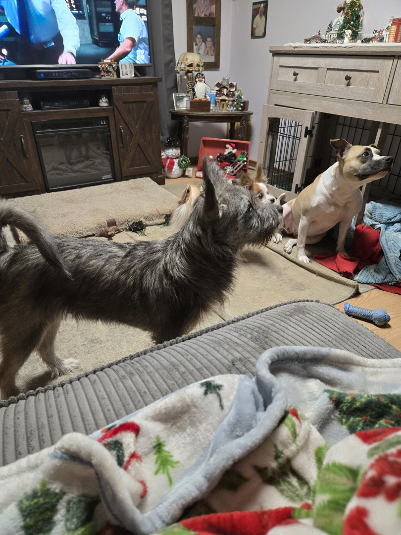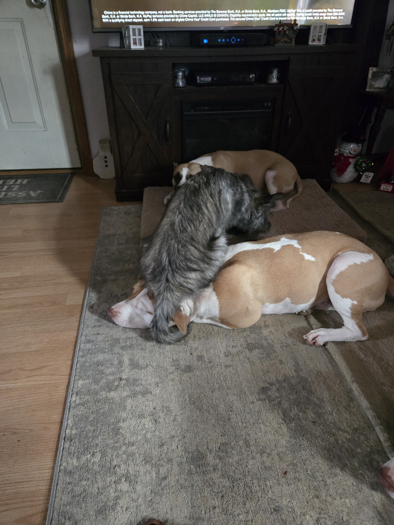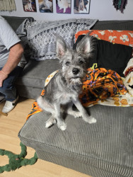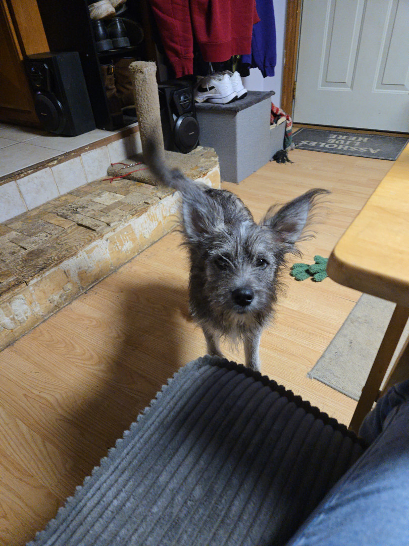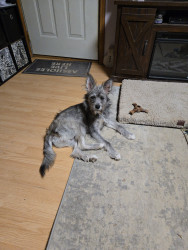 He always wants to play. Up on the couch and trys to sit in my chest and puts his head on my shoulder. He looks like he has wirey hair but his is soft to pet.