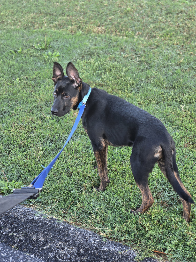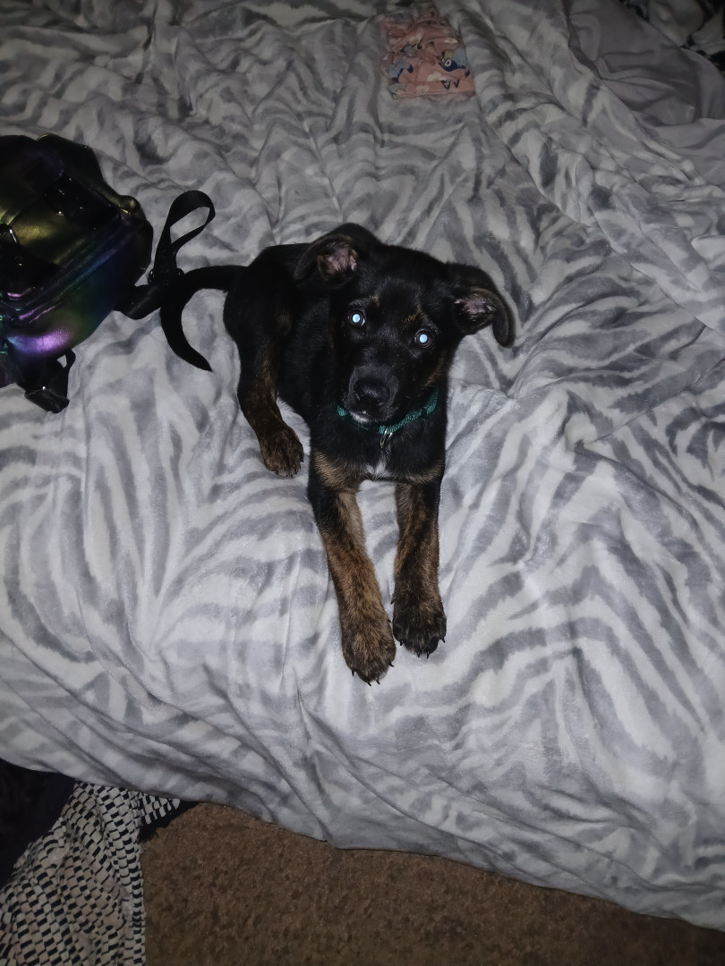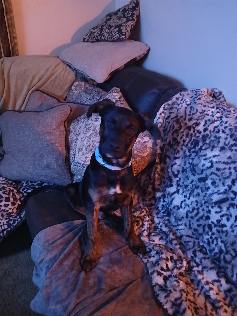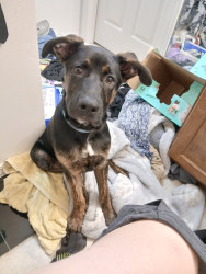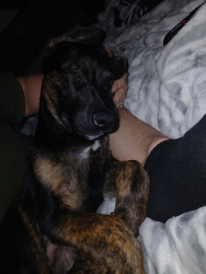 He's a boxer German shepherd mix, full of energy and loves to play he's 7 months old andLoves to throw his but around while playing
