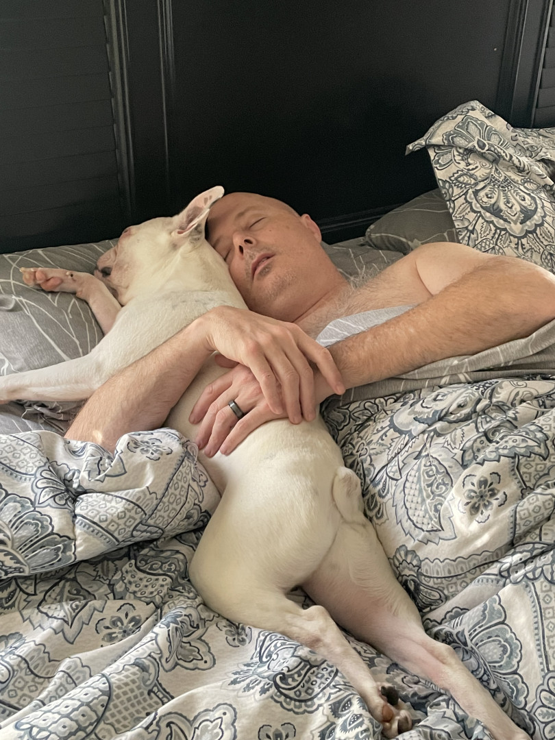 Max is the sweetest most cuddly dog ever! He sleeps with his head on the pillows in between my husband and I,just like a human!!