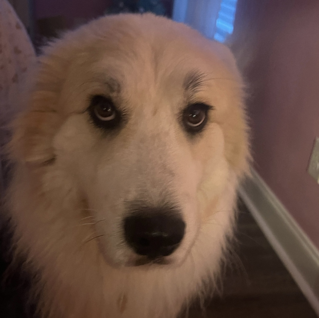 He’s a Great Pyrenees, very fluffy he loves to be outside most of the time. He loves the snow and treats and he’s good at tricks