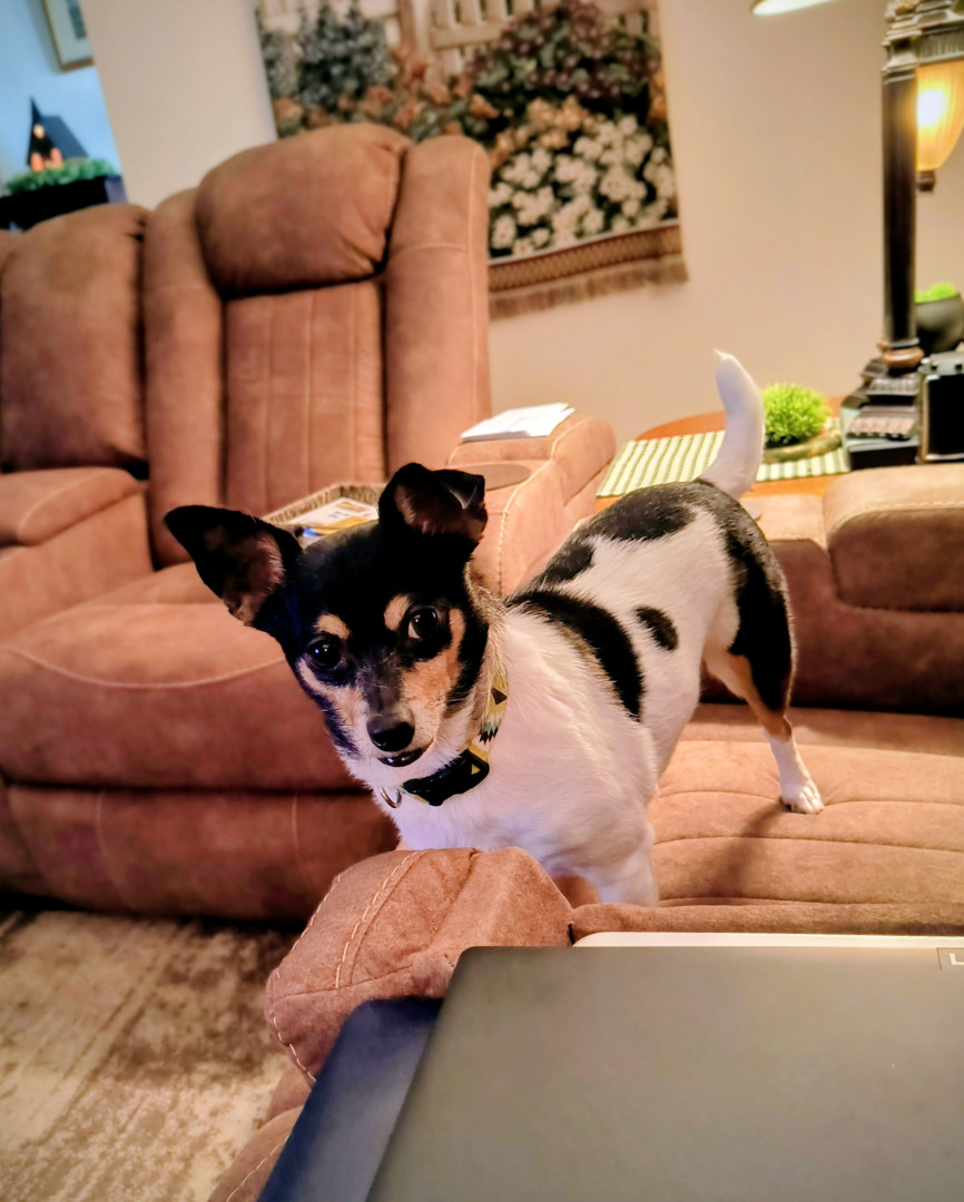 He's so nosy, usually quiet until somebody is at the door, the he goes nuts running to the door barking.