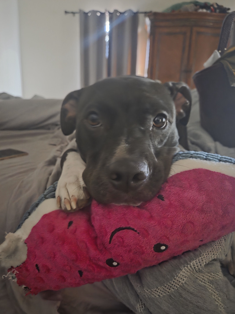 Max had a difficult start in life. He was found in the middle of a highway in. San Antonio and trying to stay alive in the freezing cold rain with cars whizzing by. He trusted us enough to run to the car for safety and we have had him ever since. He now sleeps in a comfy bed with a heating blanket and loves to learn and play. At night he cuddles between his mom and dad and never has to worry about being scared and hungry. He is a true rags to riches story and a little miracle.