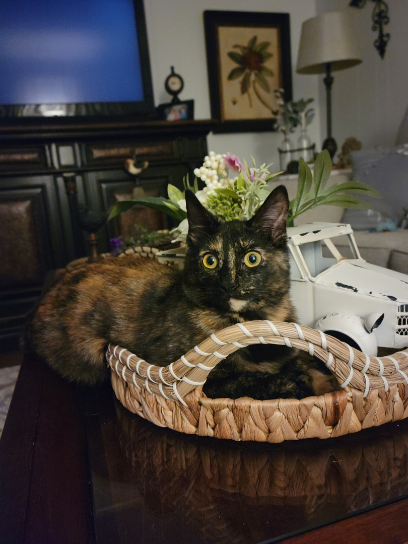 Mayhem was a ferrel rescue kitten! She has lived up to her name! Now, she is stuck to me like glue! So sweet and lovable!