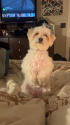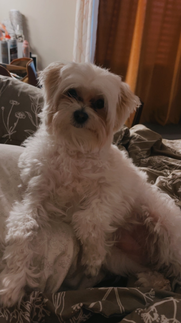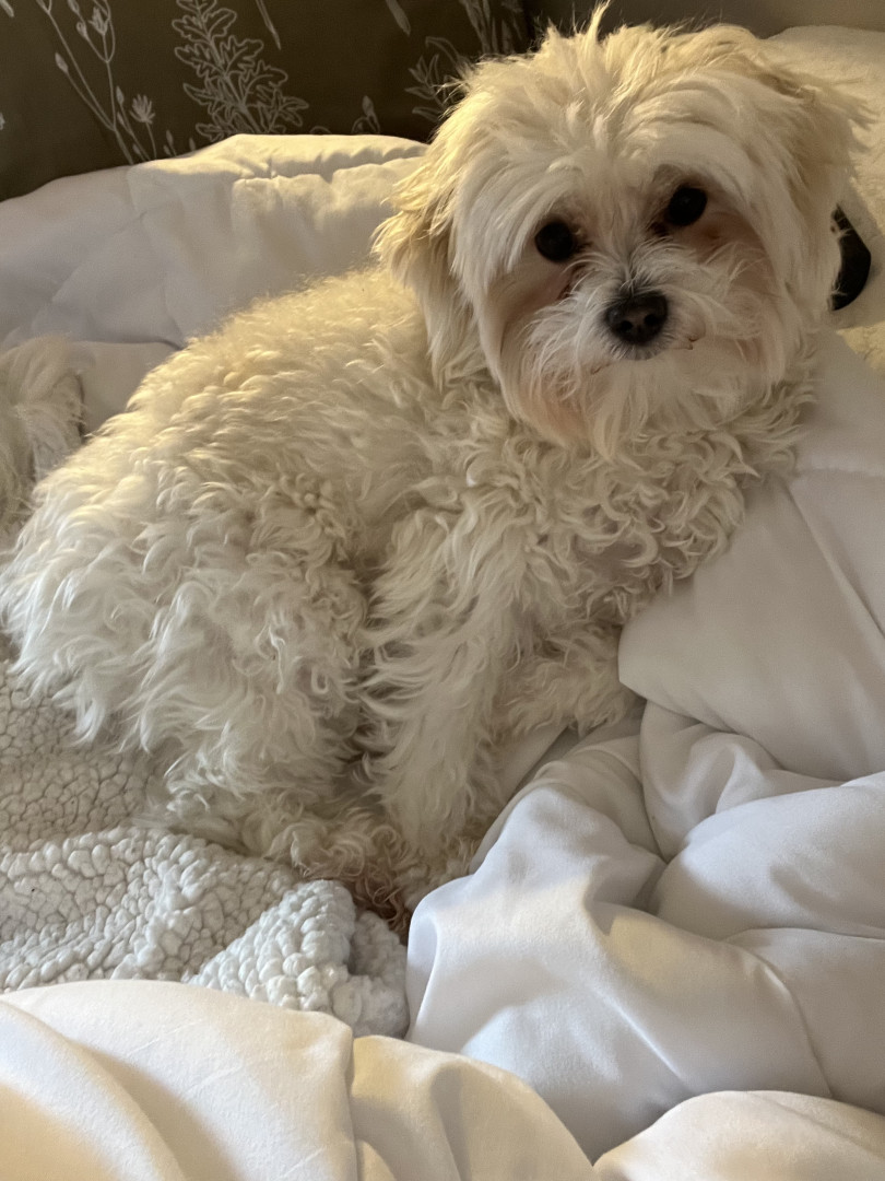 Memphis is a white and beige Maltipoo! She stands tall like a poodle but has the fur of a Maltese.