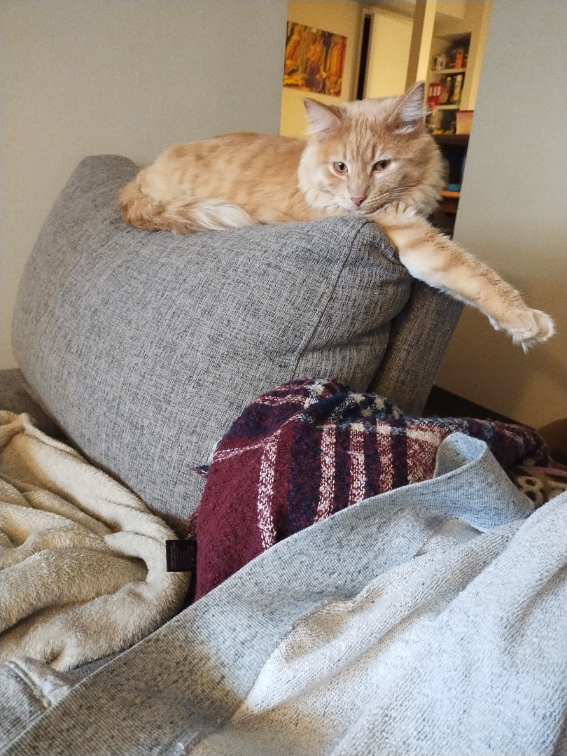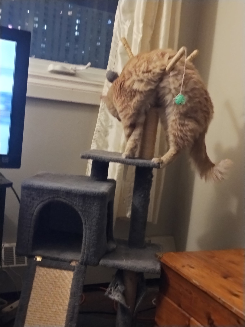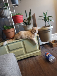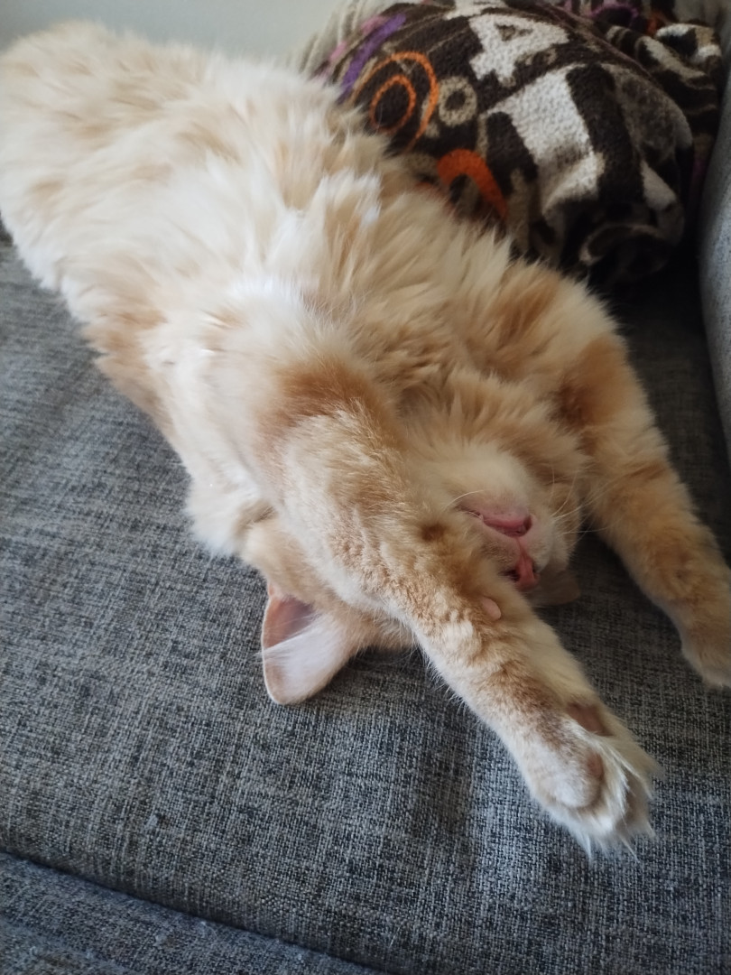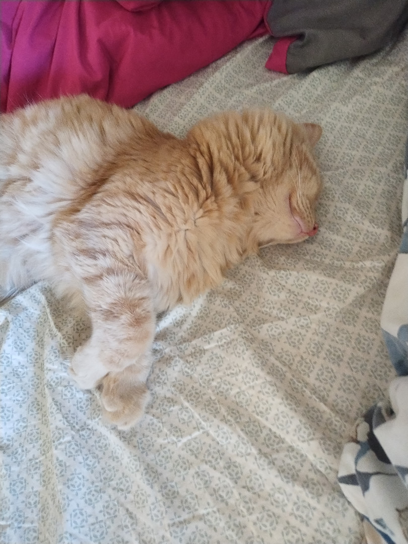 Meow meow is sweet boy. He is such a unique boy. He is huge and knows his king of the castle. I love when he comes in for snuggles. He just a big spicy baby really