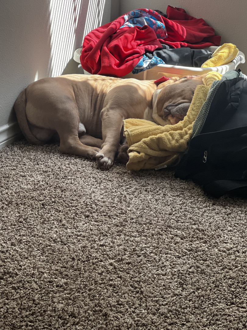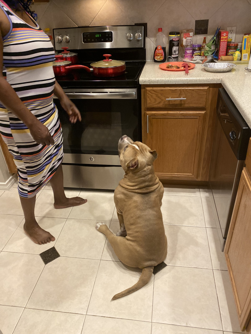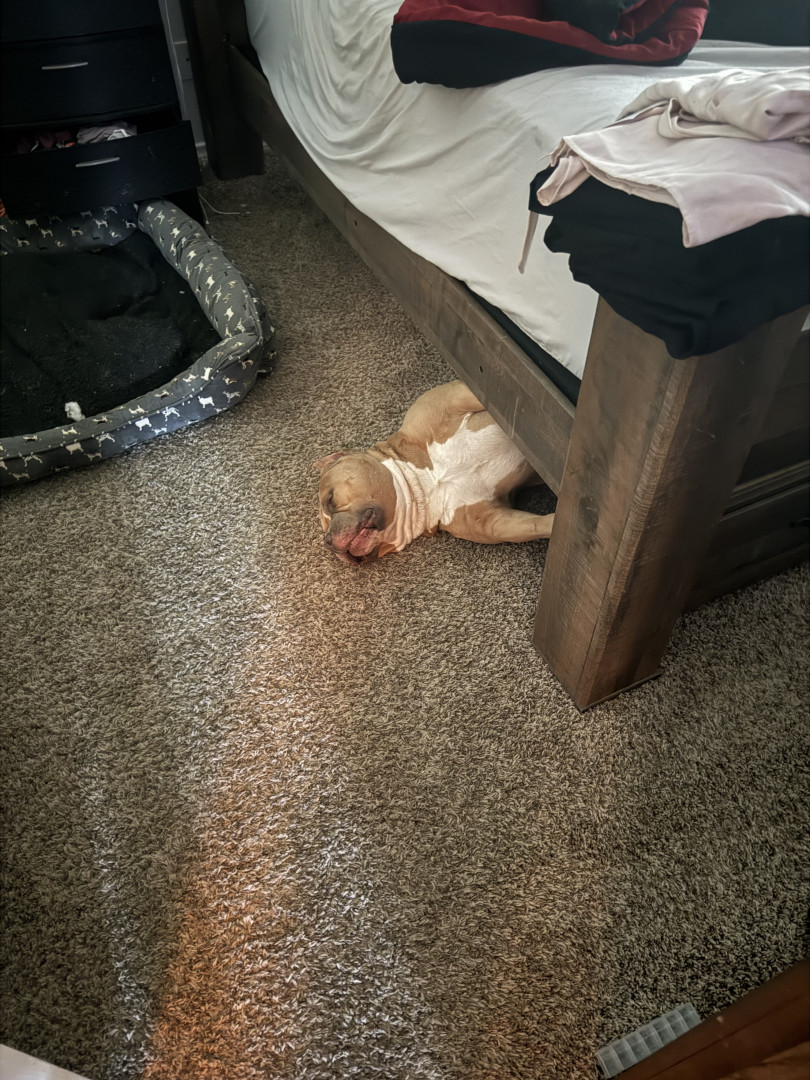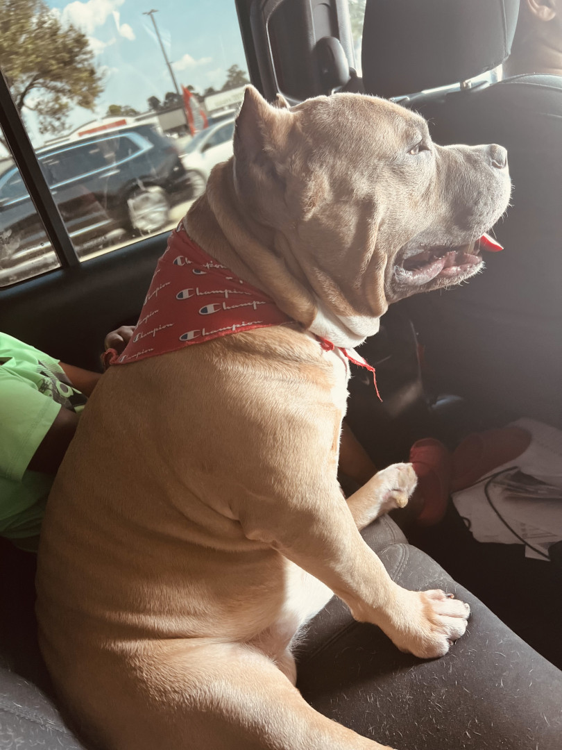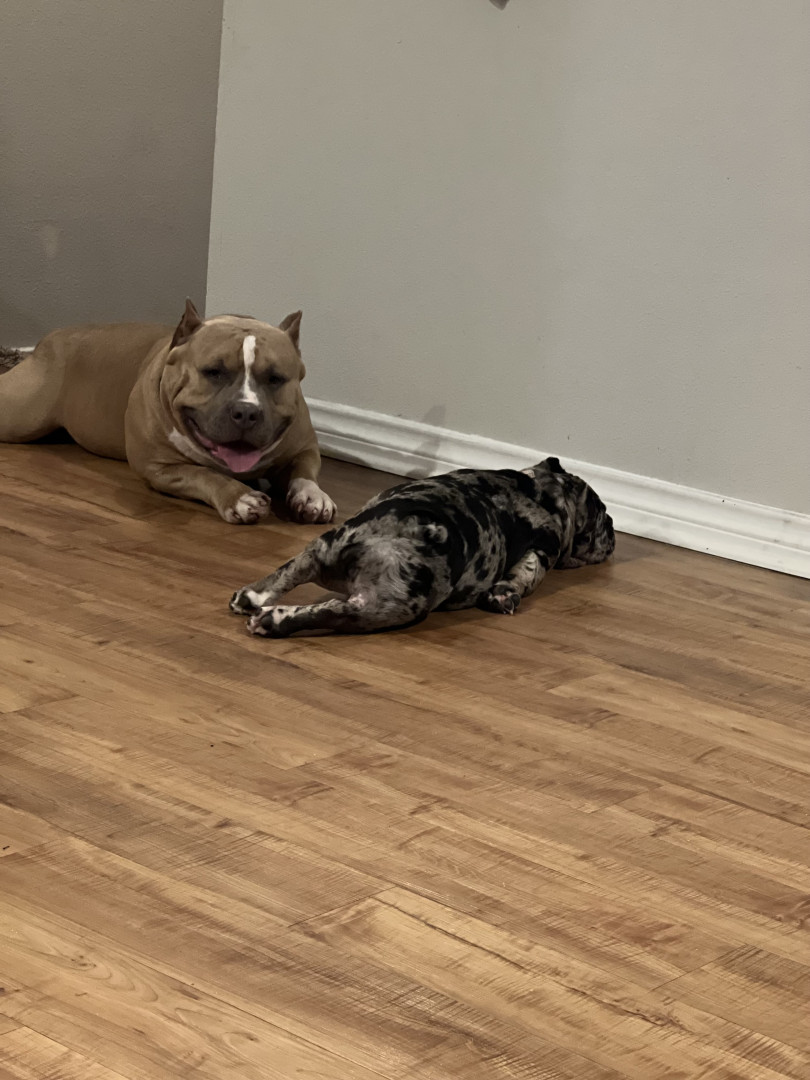 How his body is built. He has the biggest head you could ever imagine and his muscle features are so unique you cannot help to resist to touch. On the side note even though he is built in such way he can cry like a real baby in the sweetest wine u willl ever hear from a dog. A dog that can literally sit like a human